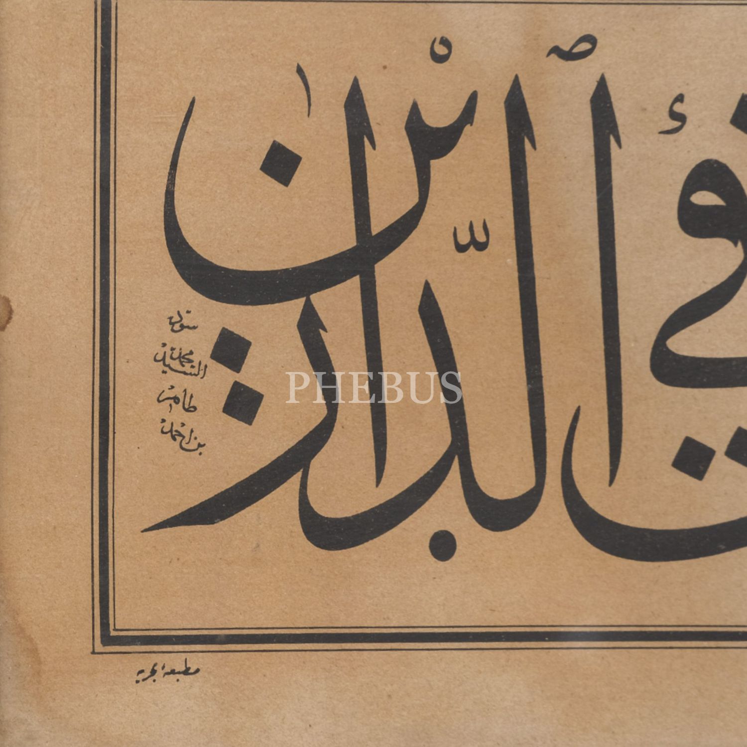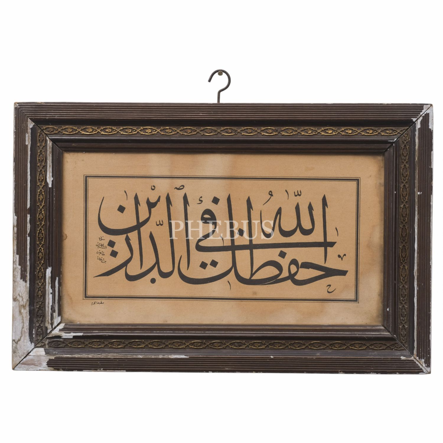 "Allah seni iki dünyada da korusun" anlamında Arapça dua. Seyyid Mehmed Tâhir hattından baskı.