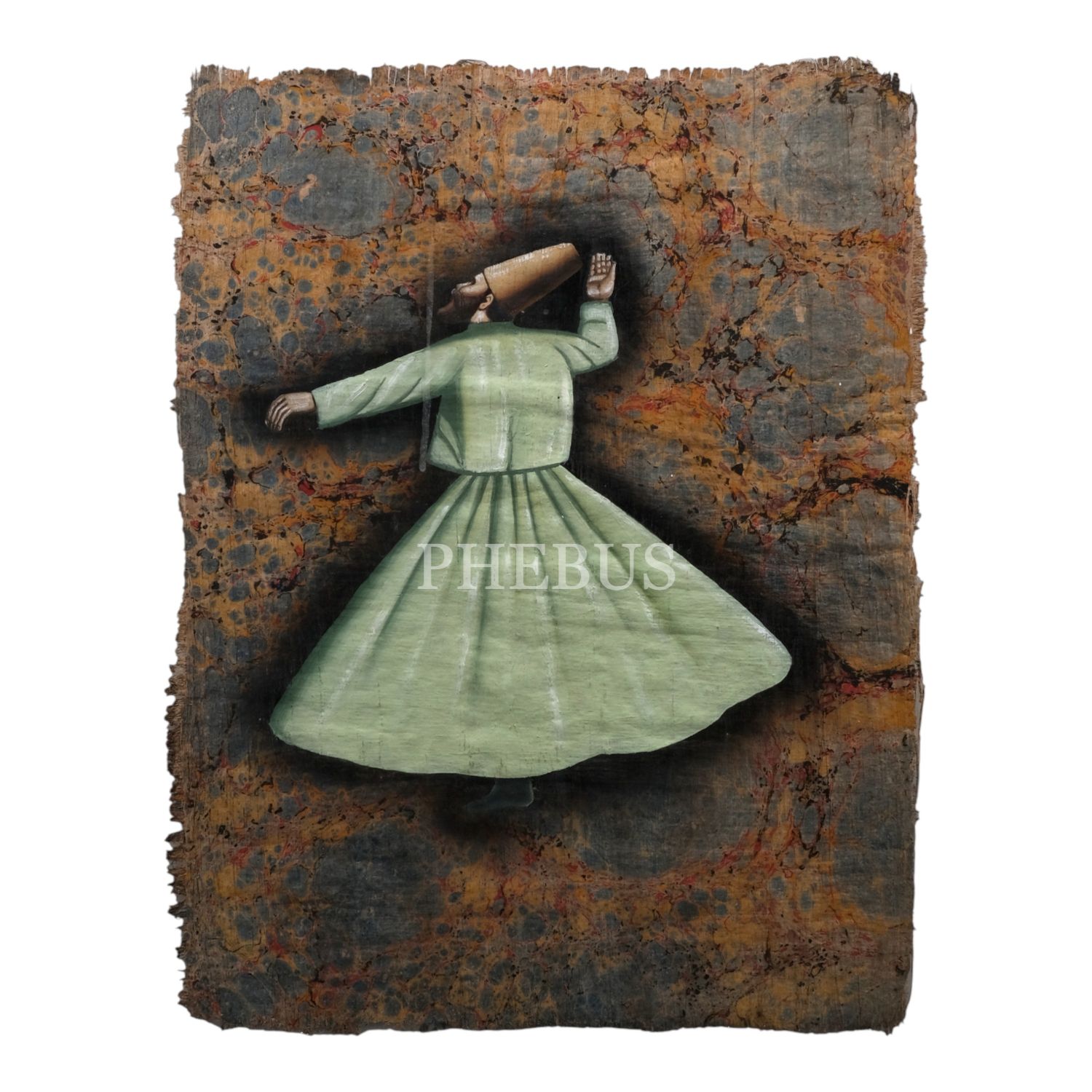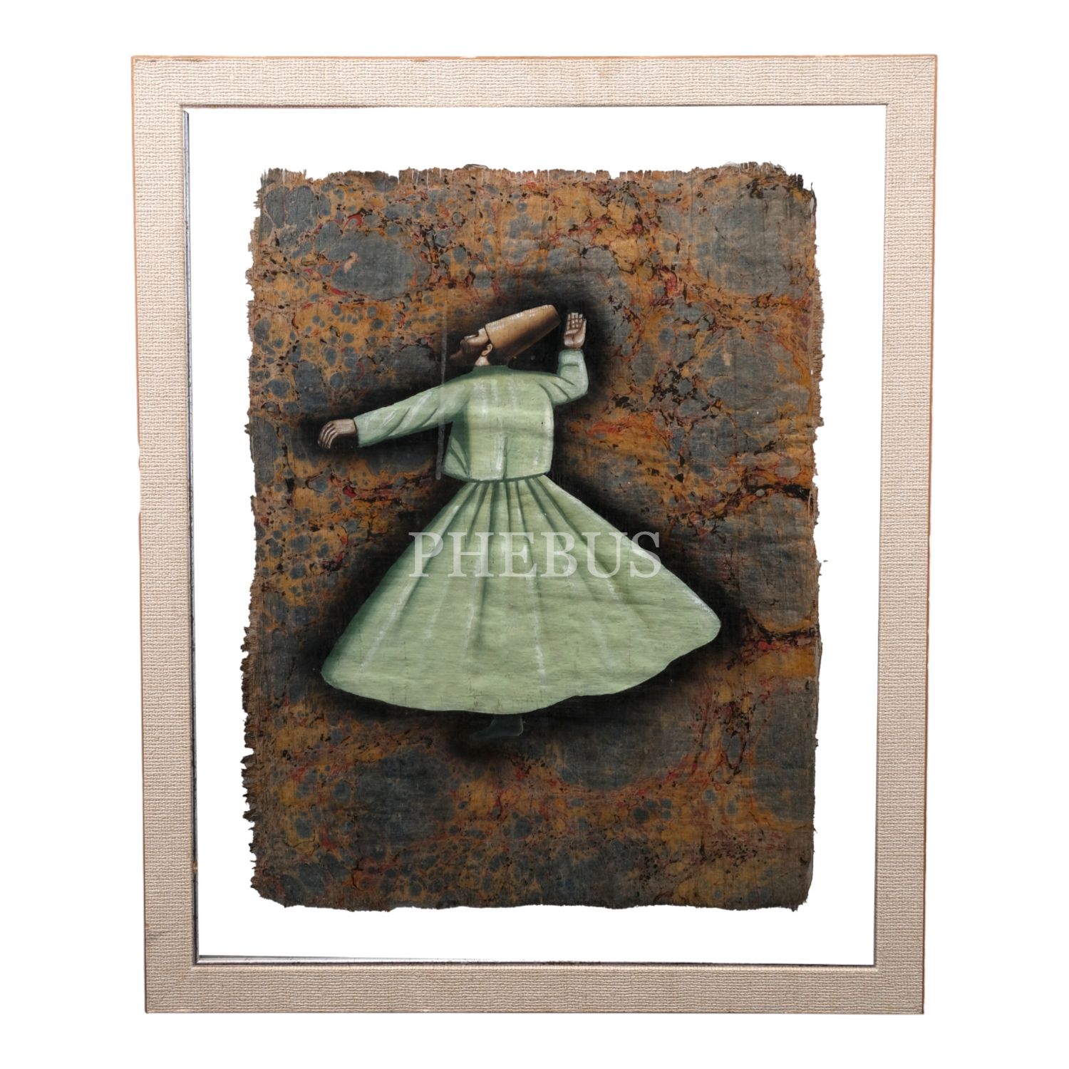 Papirüs üzerine yapılmış semazen figürlü battal ebru, ebru ölçü: 34x45 cm, çerçeve ölçü: 48x58 cm...
