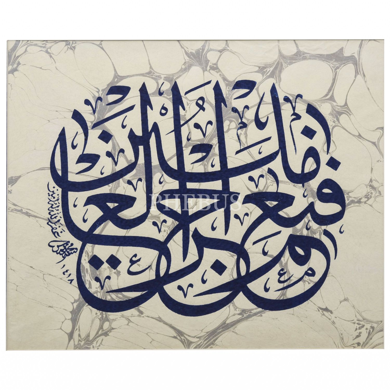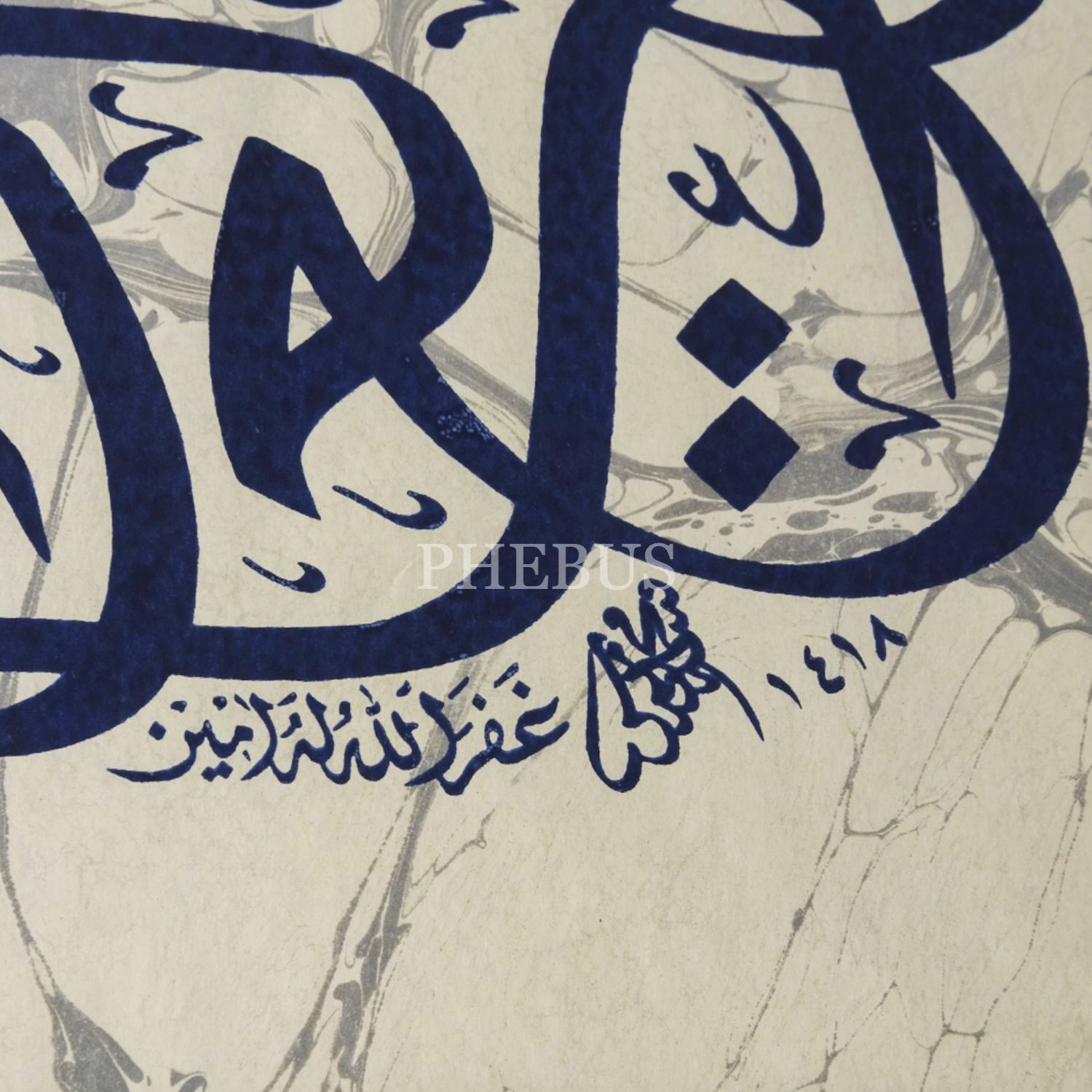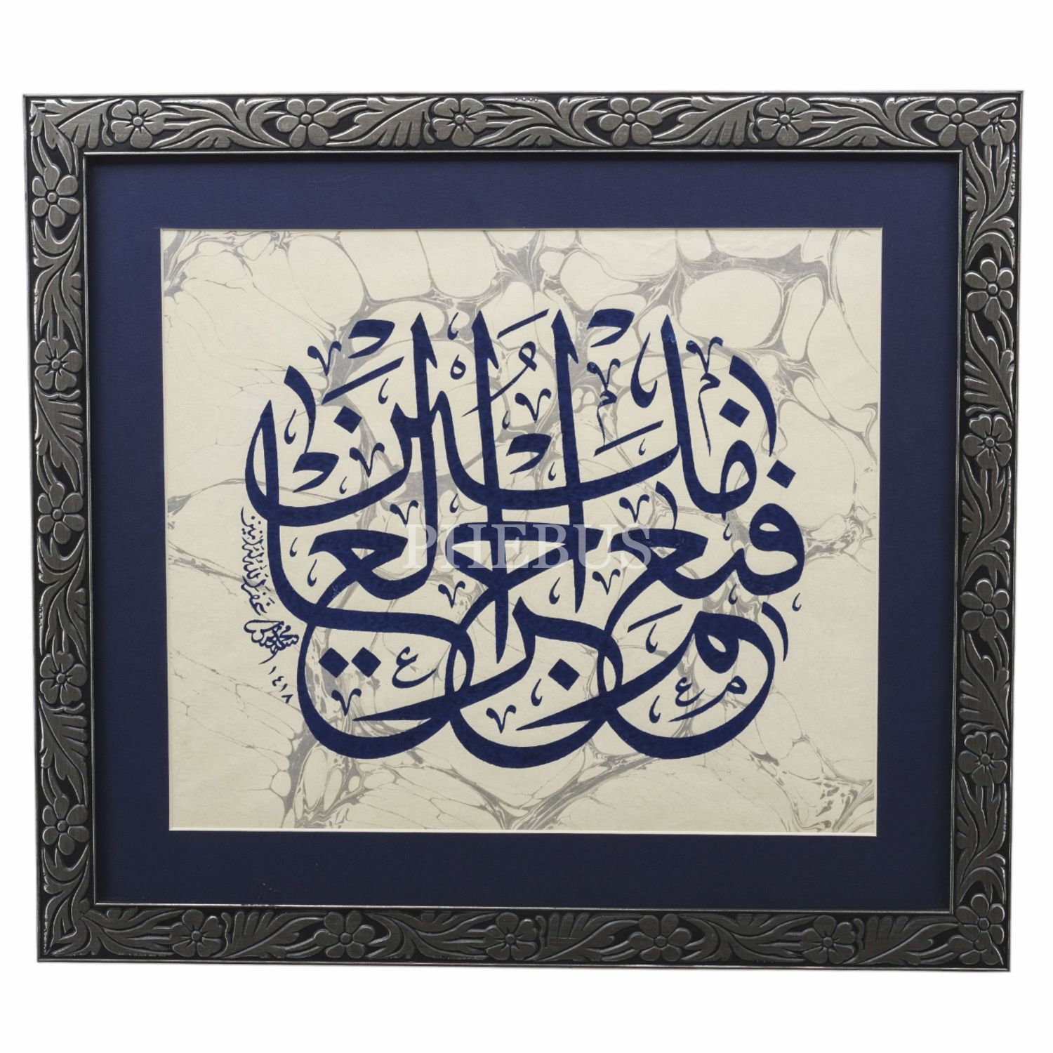 Yaldızlı battal ebru üzerine Lahor çividi kullanılarak hazırlanmış serigrafi baskı yazı, ebru ölçü: 34x29 cm, çerçeve içi paspartu: 40x36 cm...