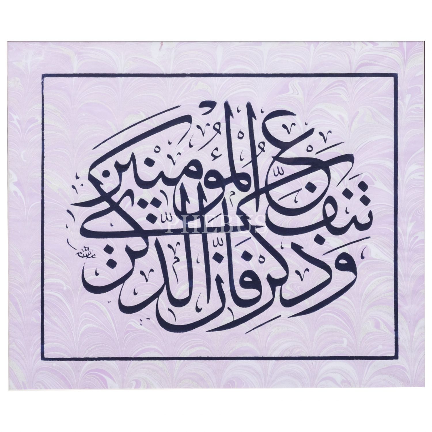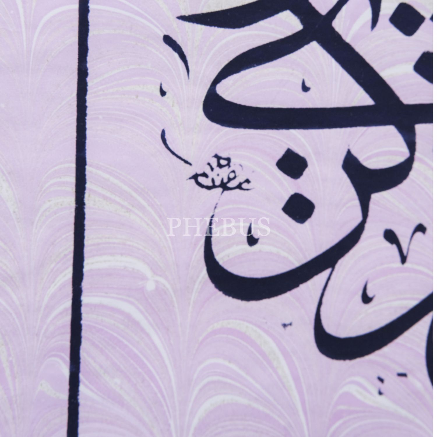 Serigrafi tekniğiyle yaldızlı şal ebru üzerine basılmış sülüs âyet, ebru ölçü: 35x29 cm, çerçeve içi paspartu: 42x36 cm...
