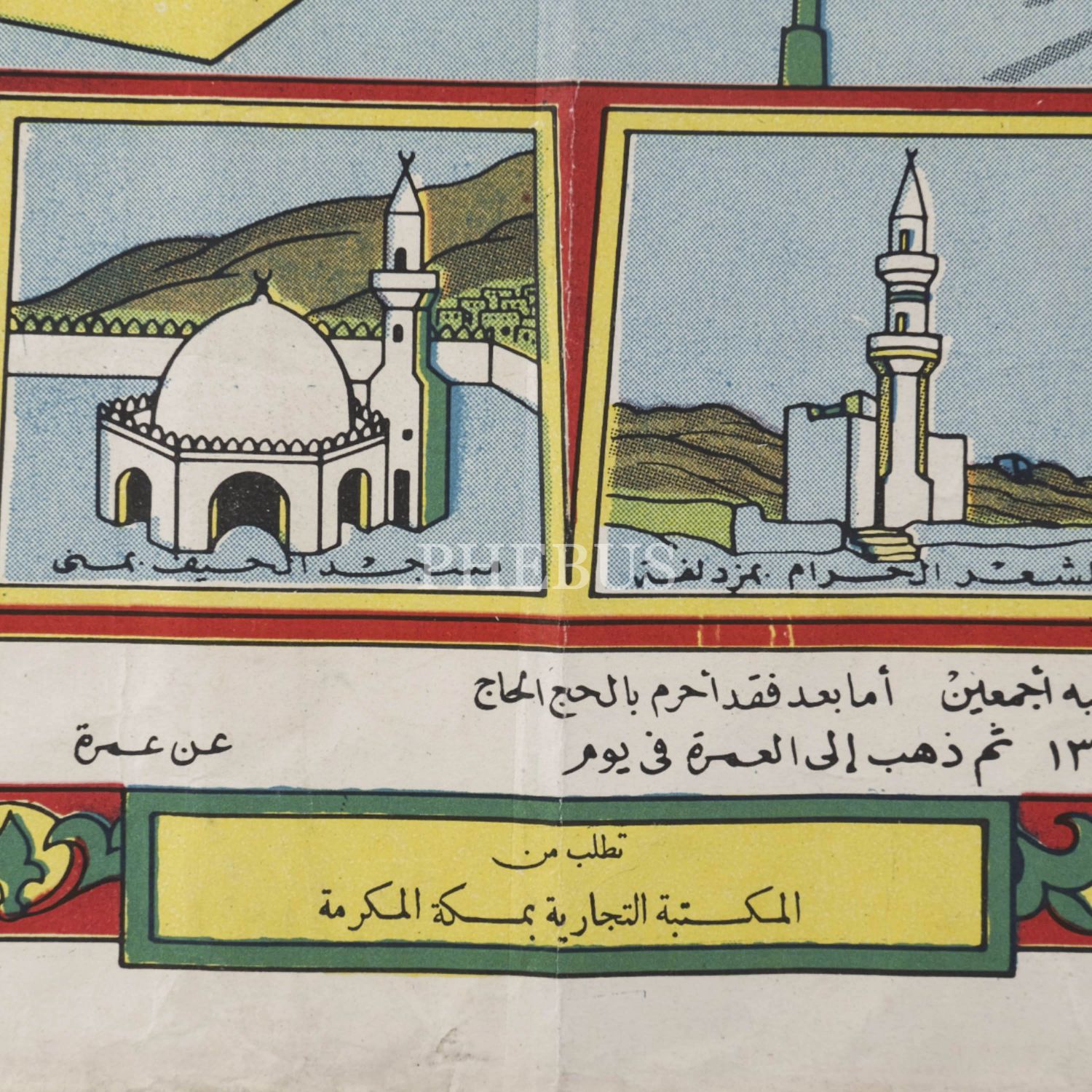 Kabe ve önemli mescidlerin resminin olduğu Arapça hac ve umre yapma belgesi. Alttaki beyaz satırda hac ve umre için tarih, kişi ve şahitler için boşluk bırakılmıştır. Belgeyi alan kişinin ihrama girerek haccın farz, vacib, sünnet ve hükümlerini yerine getirdiği, sonra umreye de katıldığı bilgisi hazır olarak yazılıdır. Belge tamamen Arapçadır. En üstte "Bedel ani´l-Gayr" yani "Başkası Yerine Hac" başlığı vardır. Buradan belgenin vekâleten hacca gelenler için olduğu anlaşılıyor. Başlığın altında mihraplara yazılan iki âyetten biri olan "(Namazda) yüzünü Mescid-i Haram tarafına çevir!" mealindeki Bakara 149. âyeti yazılıdır. Altta sırayla Mescid-i Nebevî, Cebelürrahmet, Meş´ar-i Haram, Mescid-i Hayf, Mescid-i Ten´im ve Mescid-i Aksa vardır. En altta ortada "Mekke´deki "Ticâriye Kitabevi´nden isteyiniz" yazılıdır.