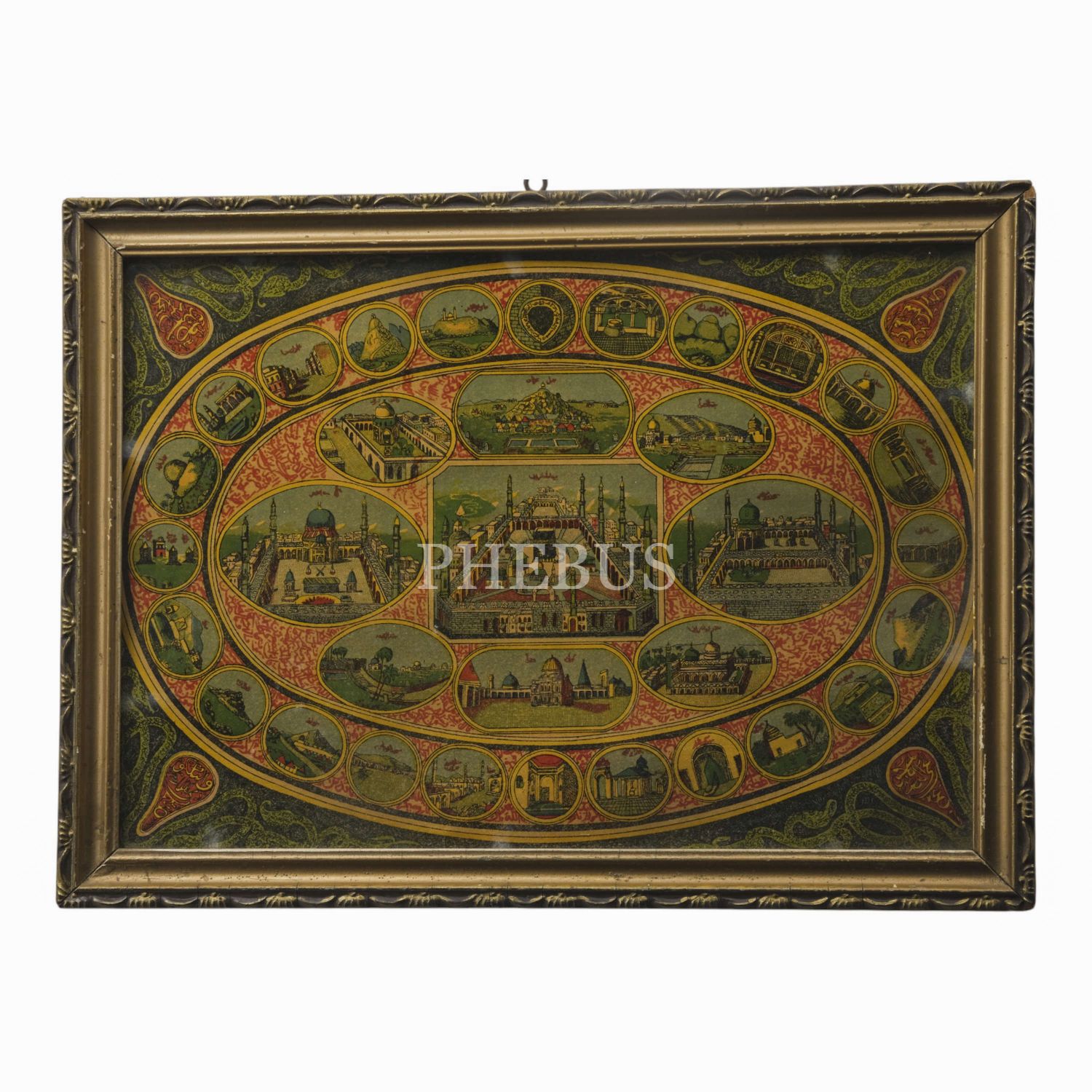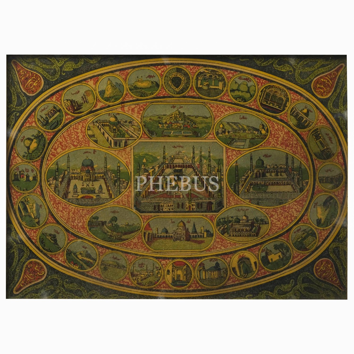 Osmanlı renkli taş baskı hac ve harameyn levhası, 33x23 cm...