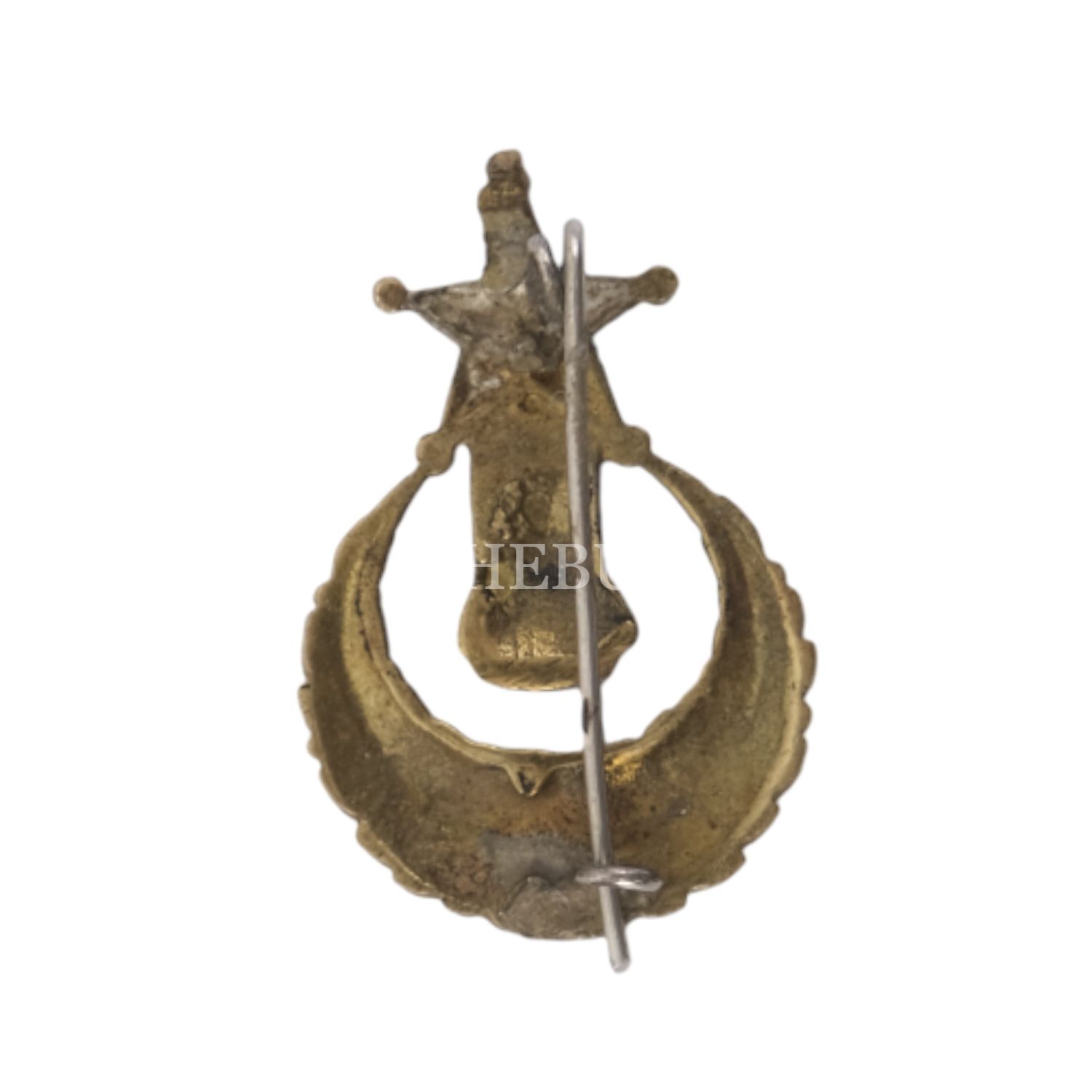 Ay-yıldız formunda, mevlevî sikkeli, madalyonlu ve çelenkli mâşâallah yazılı madenî broş, 2x3 cm...