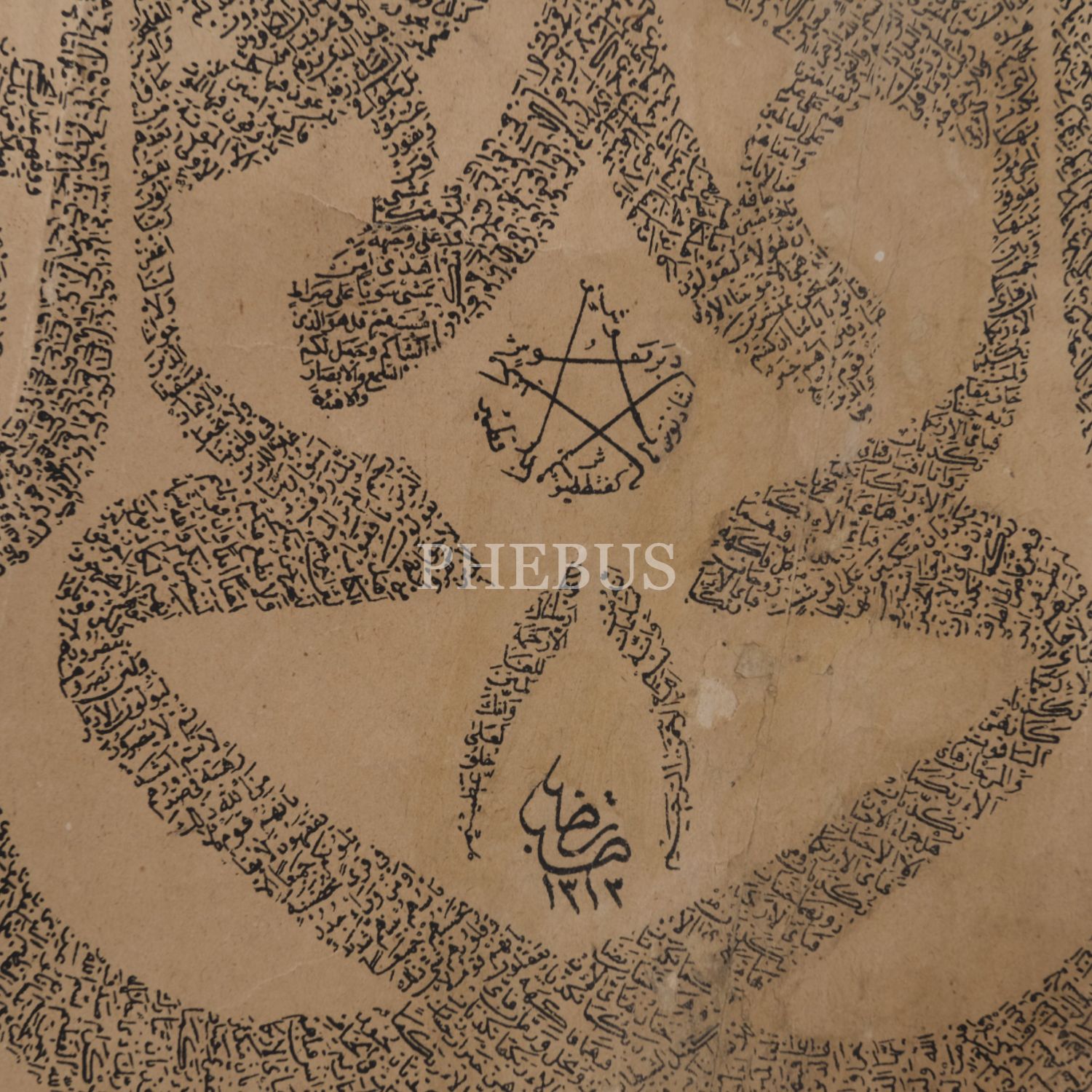Rıza ketebeli gubârî örneği. Orta kısmında müsenna tarzda "Muhammed - Ali" ve çevresinde müselsel benzeri yazıyla Hüvellâhüllezî ve gubârî kısımda Rahmân sûresi, âyetler ve kısa sureler yazılıdır. Ortadaki yıldız şeklindeki yazı Ashâb-ı Kehfin isimleri, levhanın muhafaza amaçlı yazıldığı ihtimalini gösteriyor.