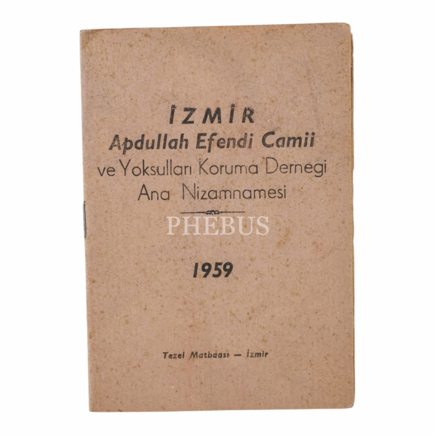 İZMİR APDULLAH EFENDİ CAMİİ vE YOKSULLARI KORUMA DERNEĞİ ANA NİZAMNAMESİ, 1959, Tezel Matbaası, İzmir, 8 sayfa, 11x15 cm...