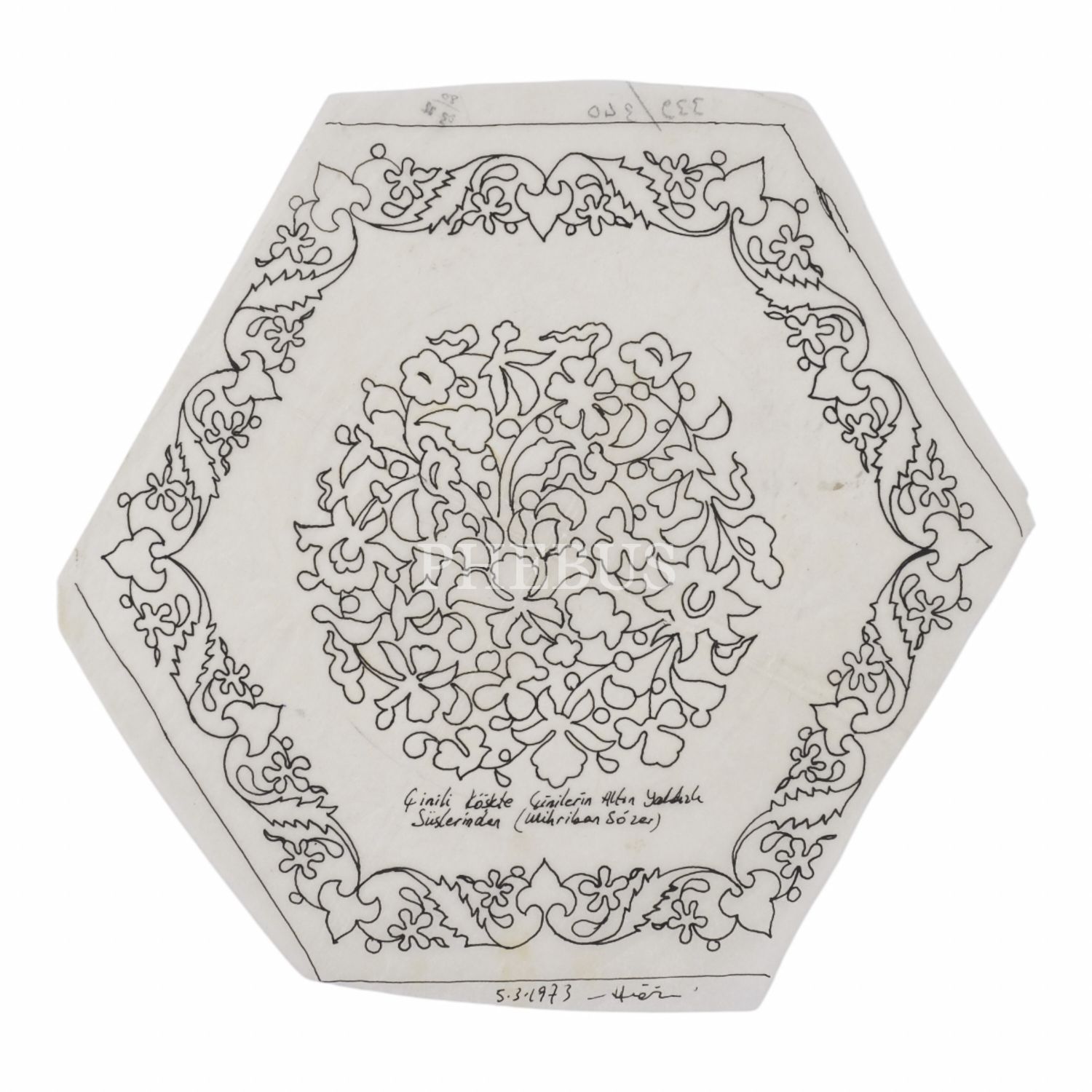 Çinili Köşk çinilerinin altın yaldızlı süslerinden bir desen örneği, 1973 tarihli, 21x20 cm...