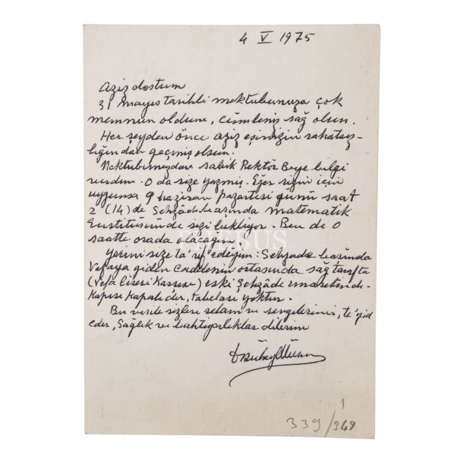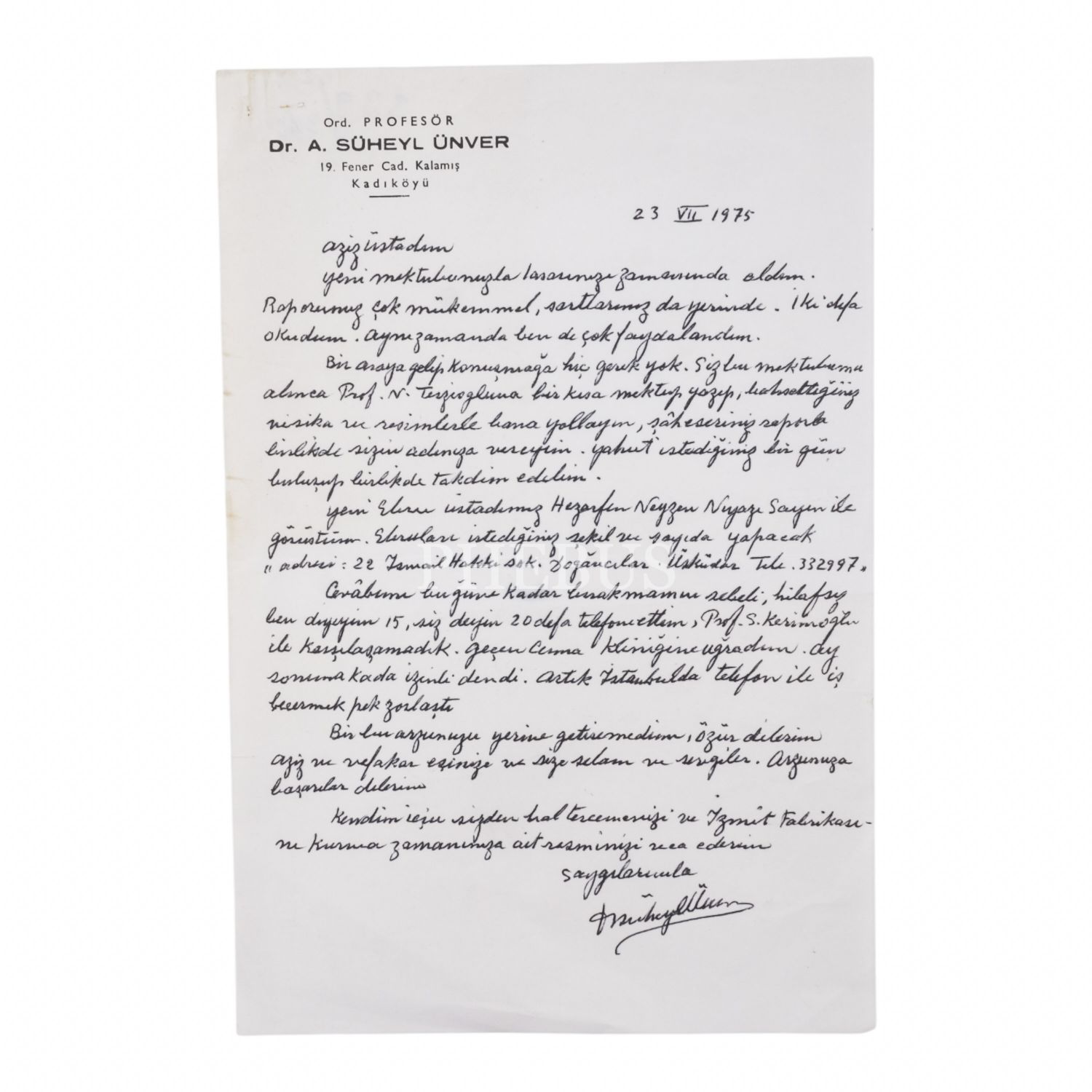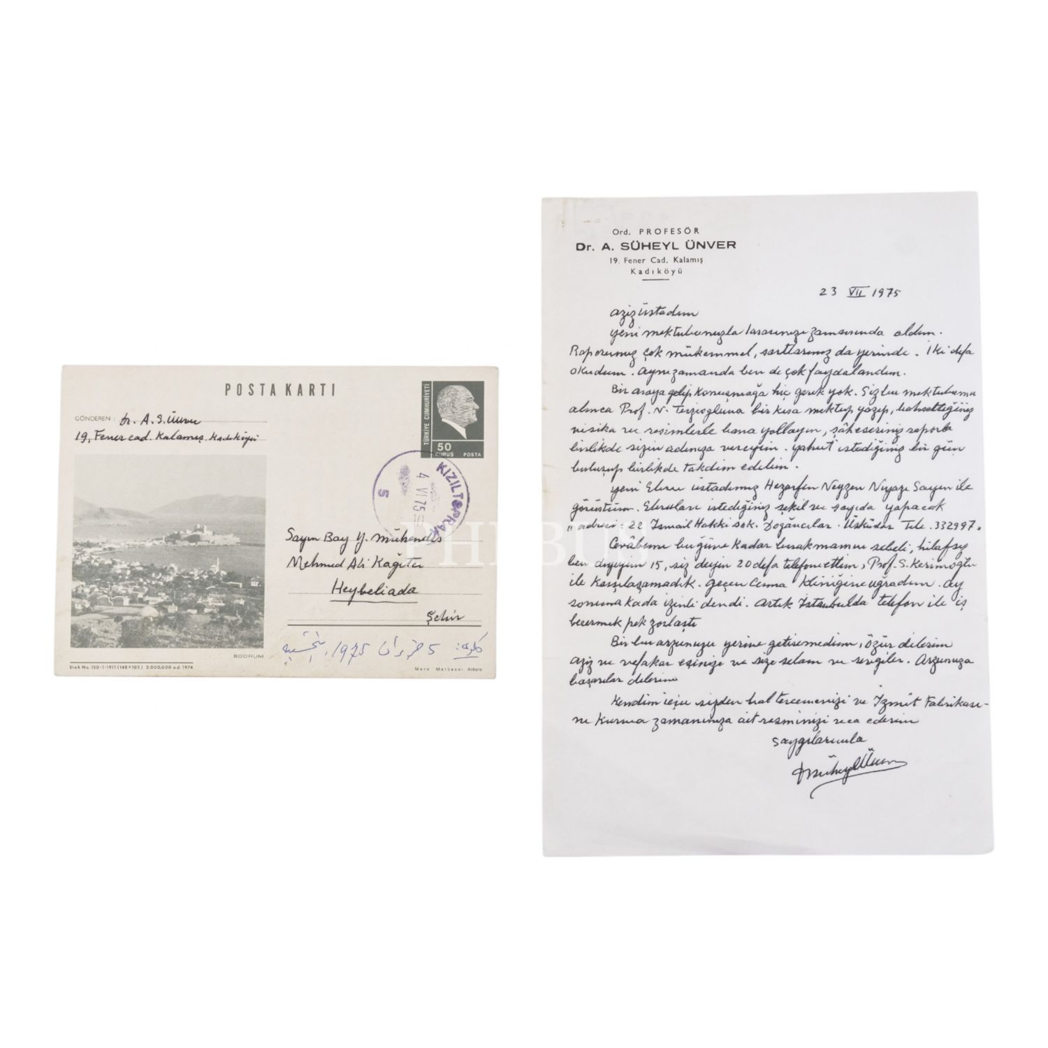Süheyl Ünver´den İzmit İzmit Kâğıt Fabrikası´nın kurucusu Mehmet Ali Kâğıtçı´ya yazılan bir mektup ve bir posta kartı, 1975 tarihli, 15x22 cm...