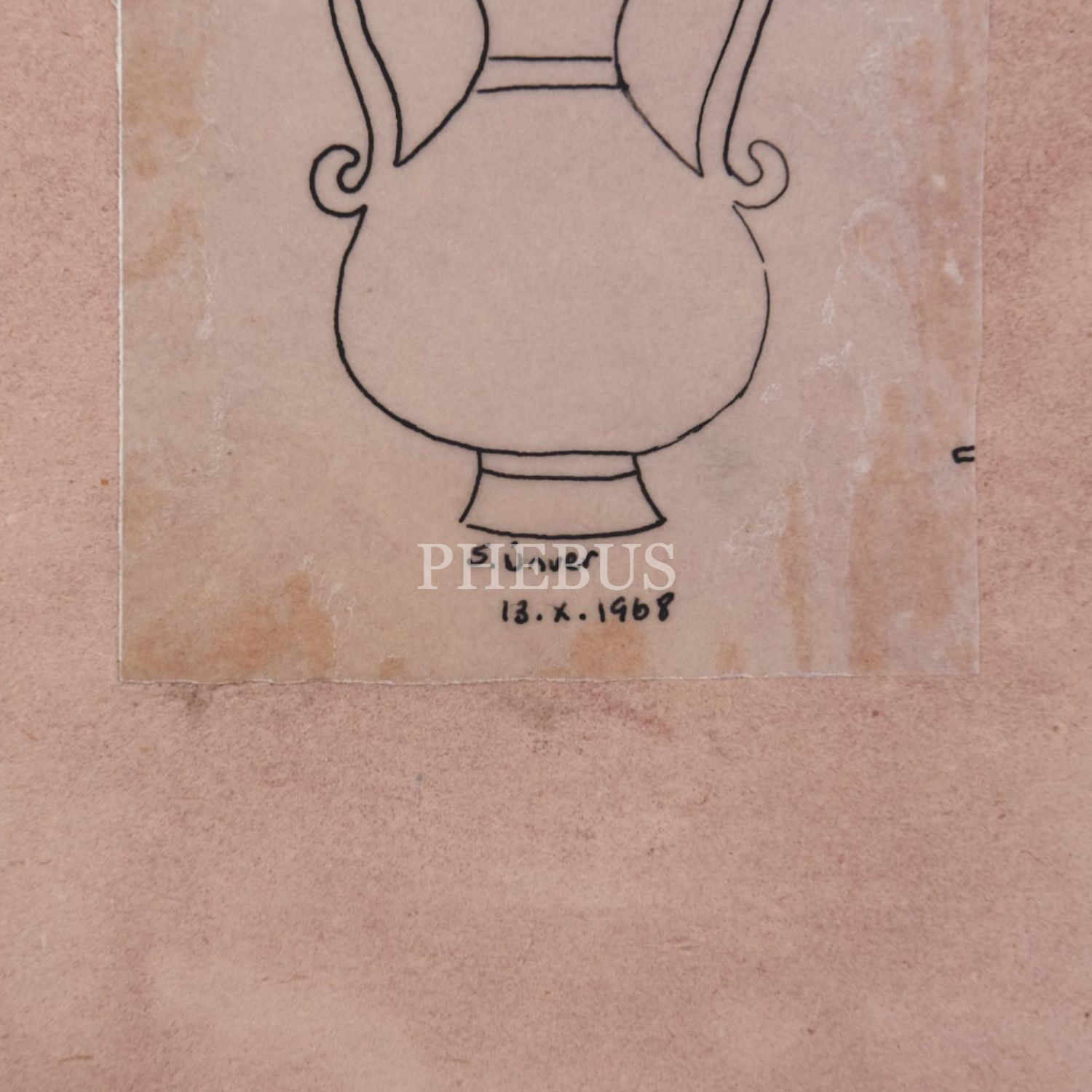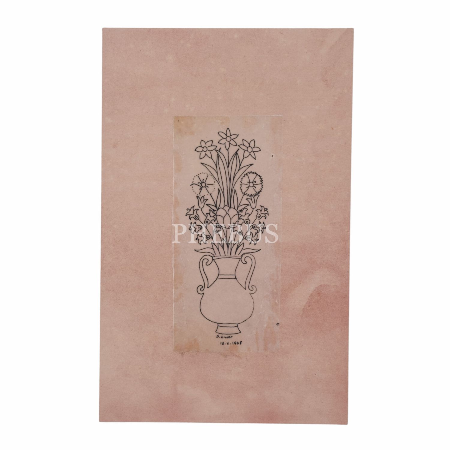 Süheyl Ünver imzalı çiçek ve vazo desenli süsleme örneği, 1968 tarihli, şeffaf kâğıt ölçü: 6x13 cm, kâğıt ölçü: 14x22 cm...