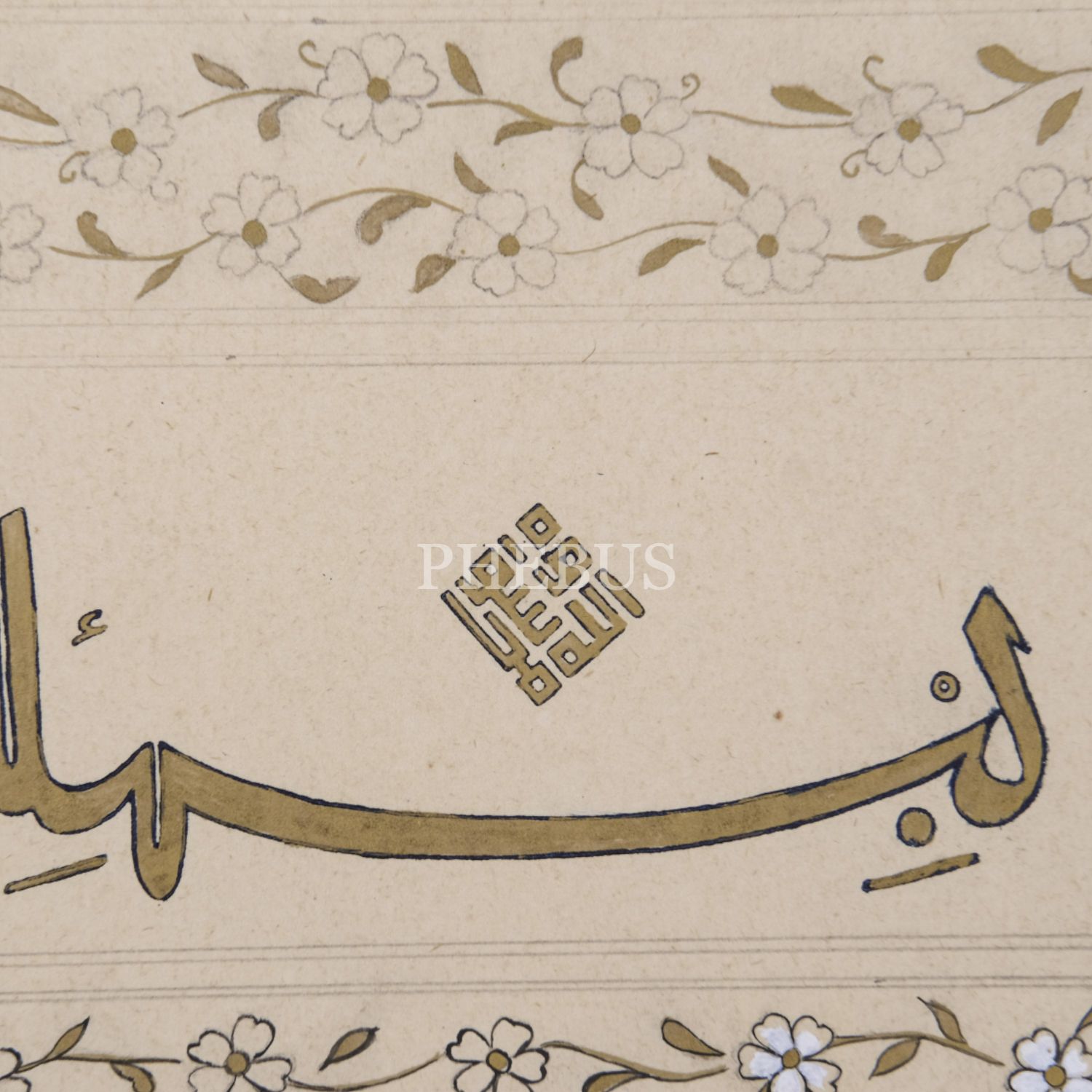 Tezhibi tamamlanmamış müselsel altın besmele ve makılî nübüvvet mührü,, yazı ölçü: 16x4 cm, kâğıt ölçü: 23x13 cm...
