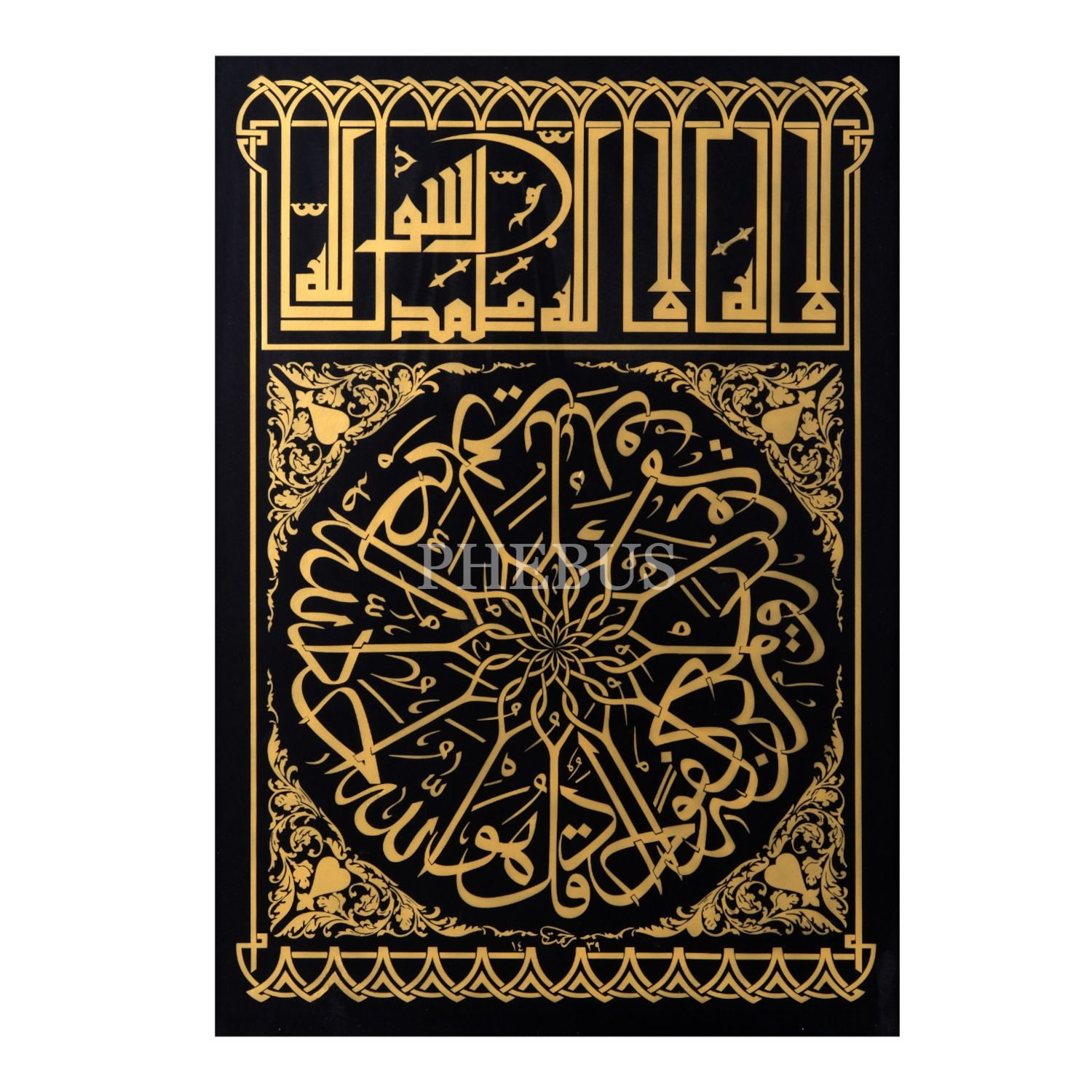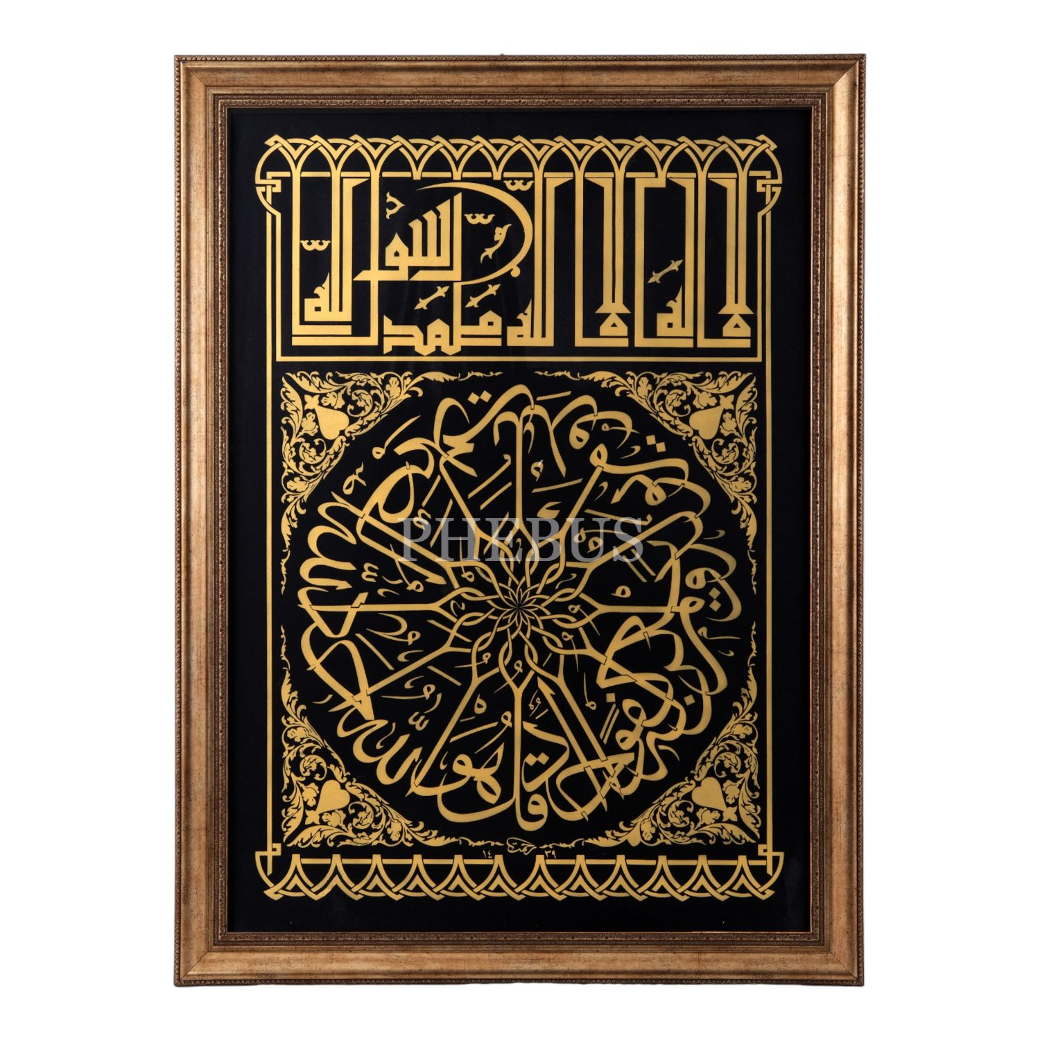 Üstteki kemerli kısımda altınla yazılmış kûfî hattıyla kelime-i tevhid, altta celî sülüs yazıyla İhlâs sûresi yazılıdır.
