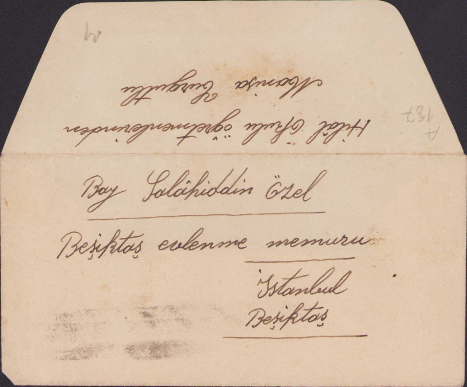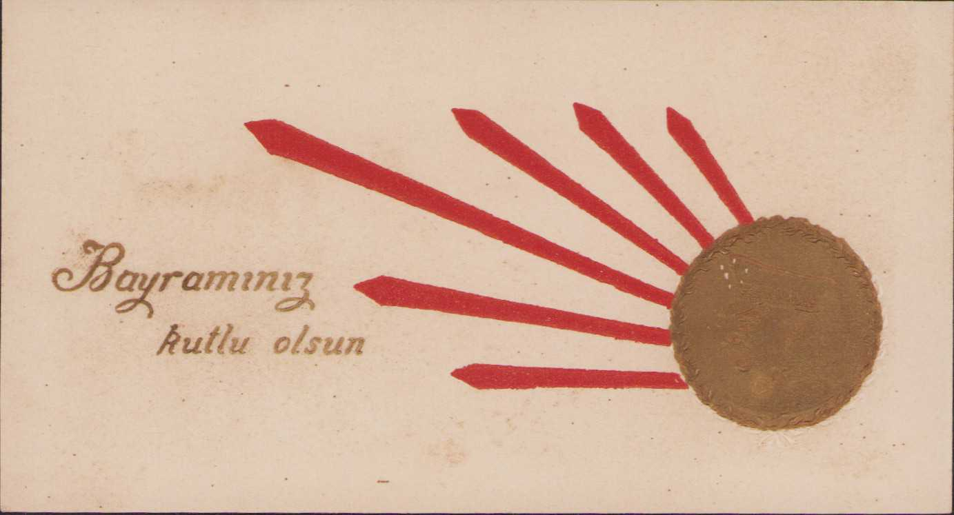 Atatürk ve Altı Ok görselli gofreli tebrik kartı, Manisa-İstanbul adresli, postadan geçmiş, 1938 tarihli, Hilali Ahmer pullu