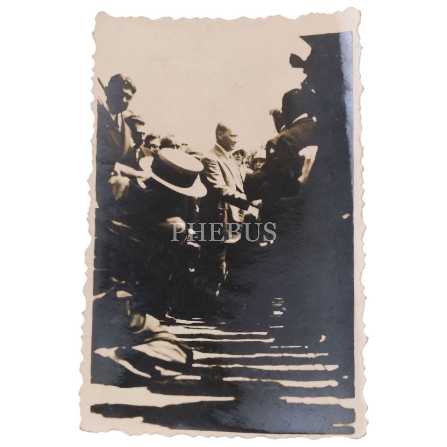 Mustafa Kemal Atatürk´ün, bir şehir ziyaretinde halkla selamlaşırken görüldüğü nadir bir fotoğrafı, 6x9 cm...