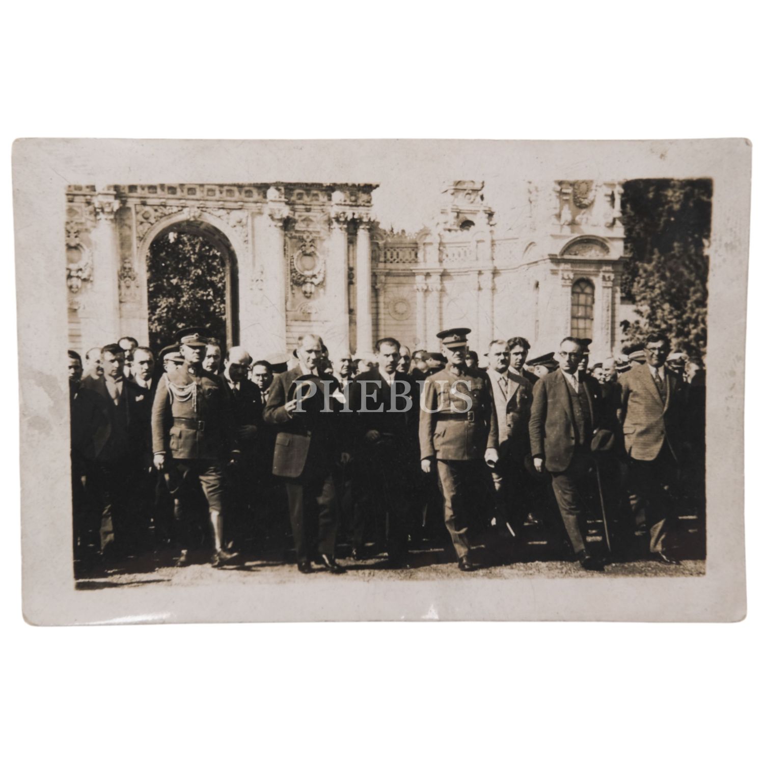 Mustafa Kemal Atatürk´ün, maiyetiyle birlikte Dolmabahçe Sarayı önünde görüldüğü nadir bir fotoğrafı, 9,5x6,5 cm...