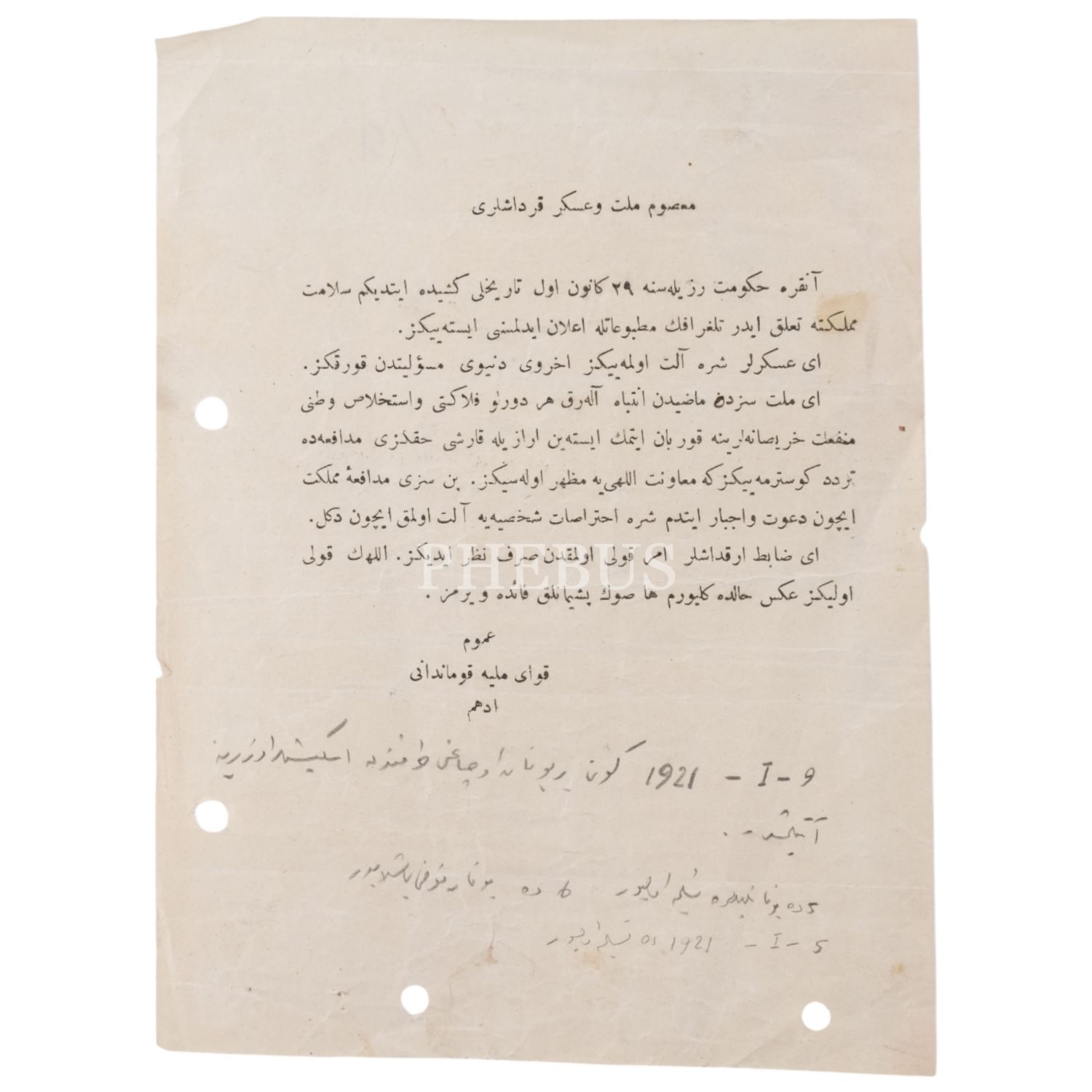Çerkez Ethem´in, "Umum Kuvayi Milliye Kumandanı Edhem" unvanıyla yayımladığı "Masum millet ve asker kardeşlere" başlıklı, Ankara Hükümeti´nin kurduğu düzenli orduya katılan askerlere bu işten vazgeçmeleri gerektiğini tehditkar bir üslupla dile getirdiği bildirisi, 16x21 cm...