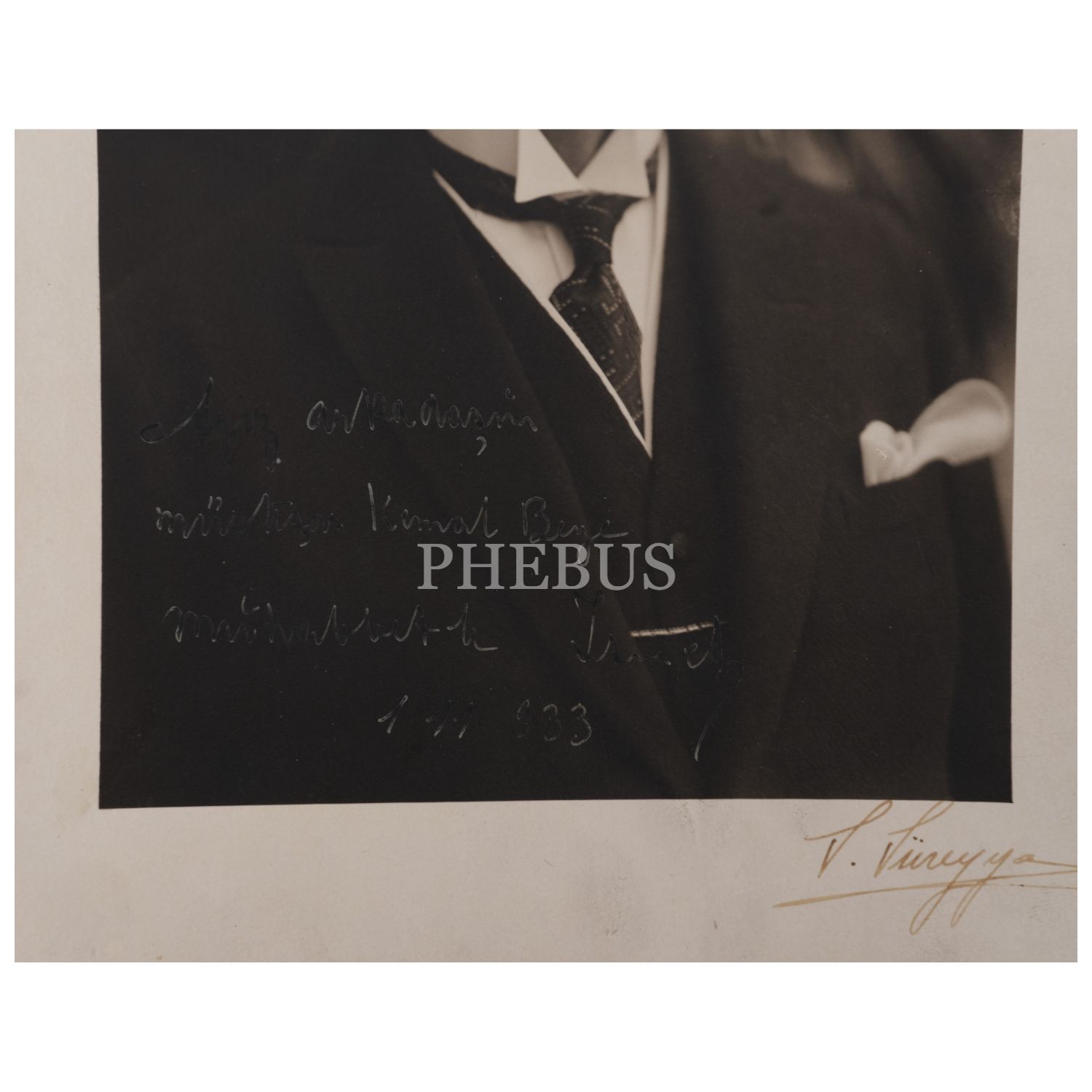 İsmet İnönü´nün, "Aziz arkadaşım Müsteşar Kemal Beye." ithafıyla, 1 Kasım 1933 tarihinde imzaladığı stüdyo portre fotoğrafı, fotoğrafçı Süleyman Süreyya Bükey´in "S. Süreyya" şeklinde imzaladığı paspartusuyla birlikte 21x28,5 cm...