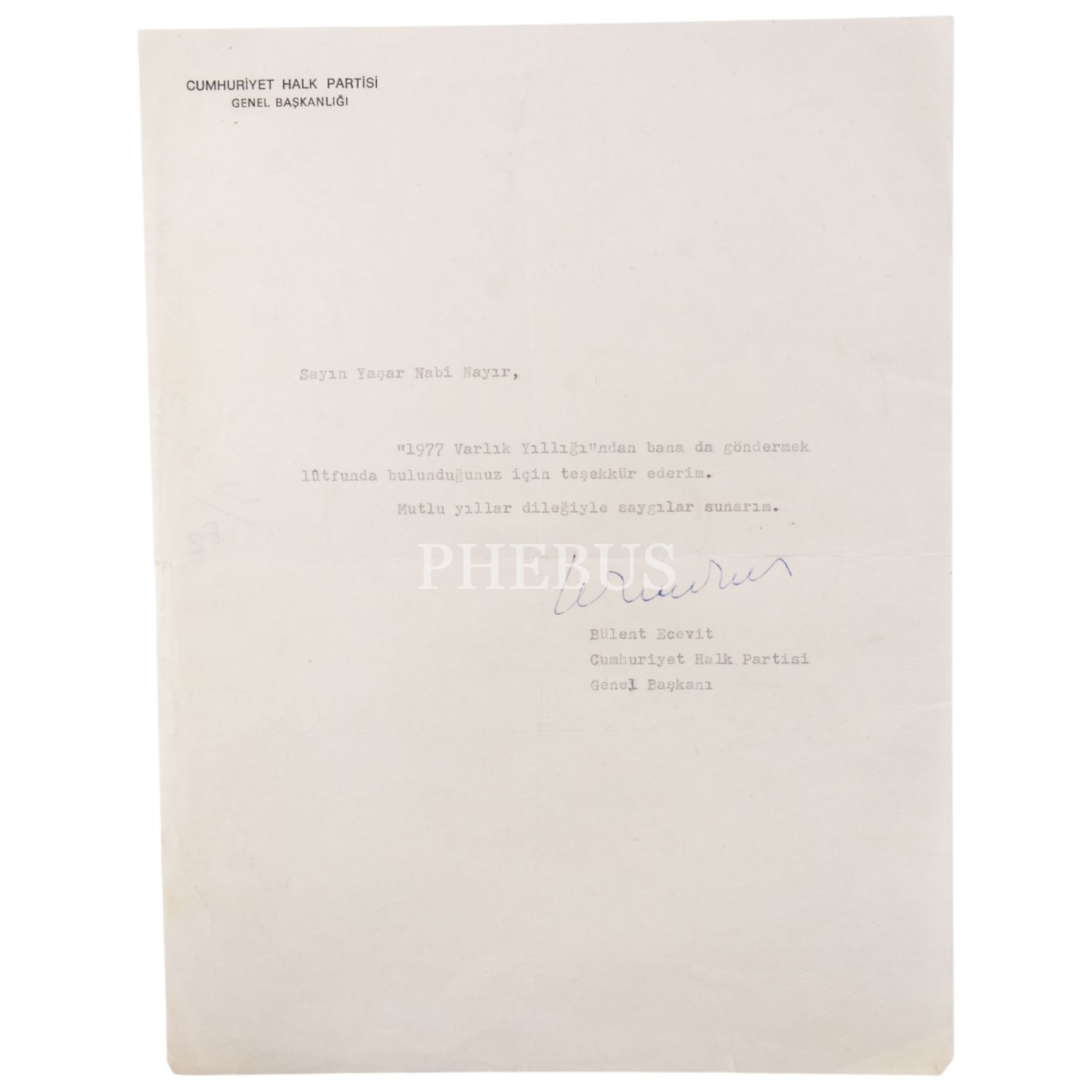 Bülent Ecevit´ten Yaşar Nabi Nayır´a gönderilmiş daktilo teşekkür mektubu, ıslak imzalı, 19,5x26 cm...