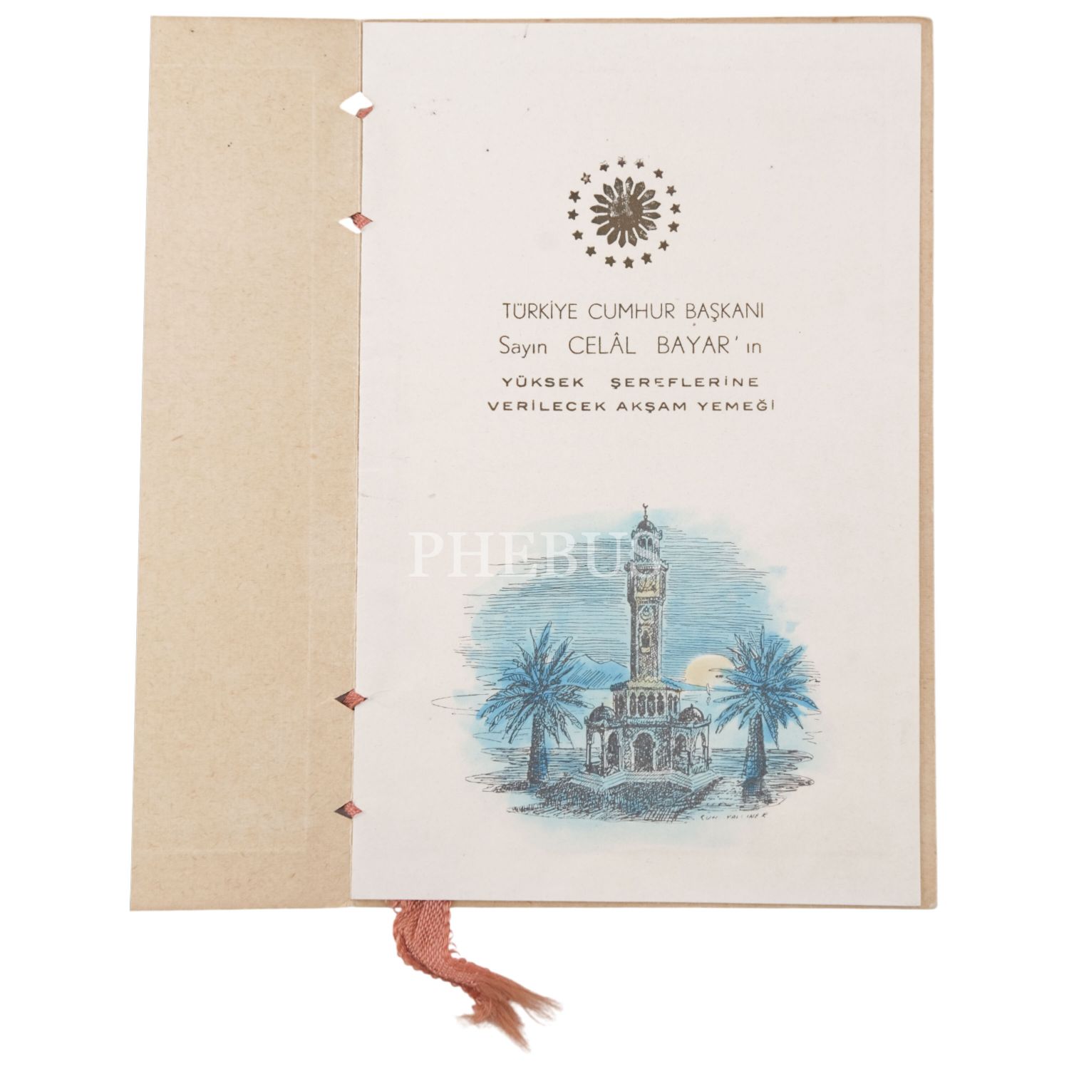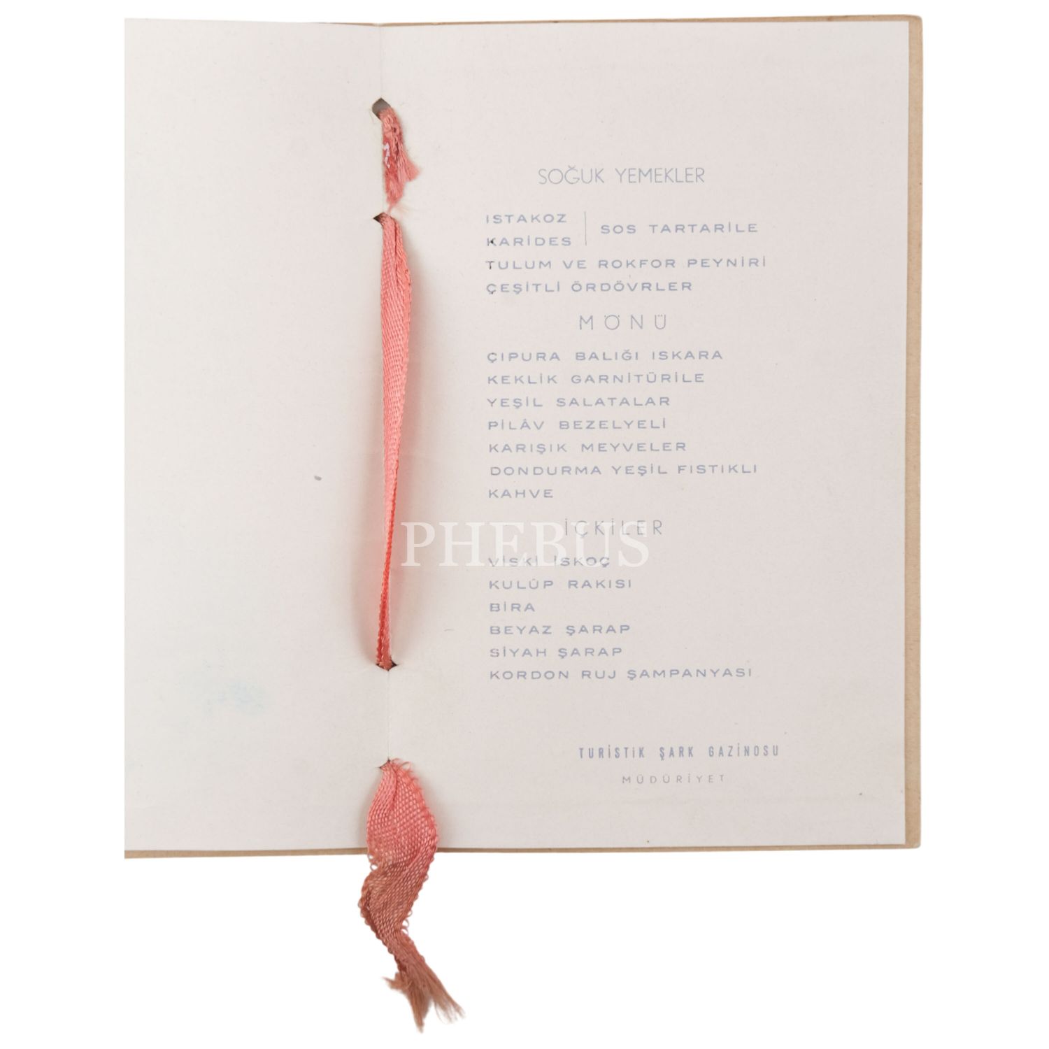 "Türkiye Cumhur Başkanı Sayın Celâl Bayar´ın Yüksek Şereflerine Verilecek Akşam Yemeği"nin menüsü, Turistik Şark Gazinosu, 11x17 cm...