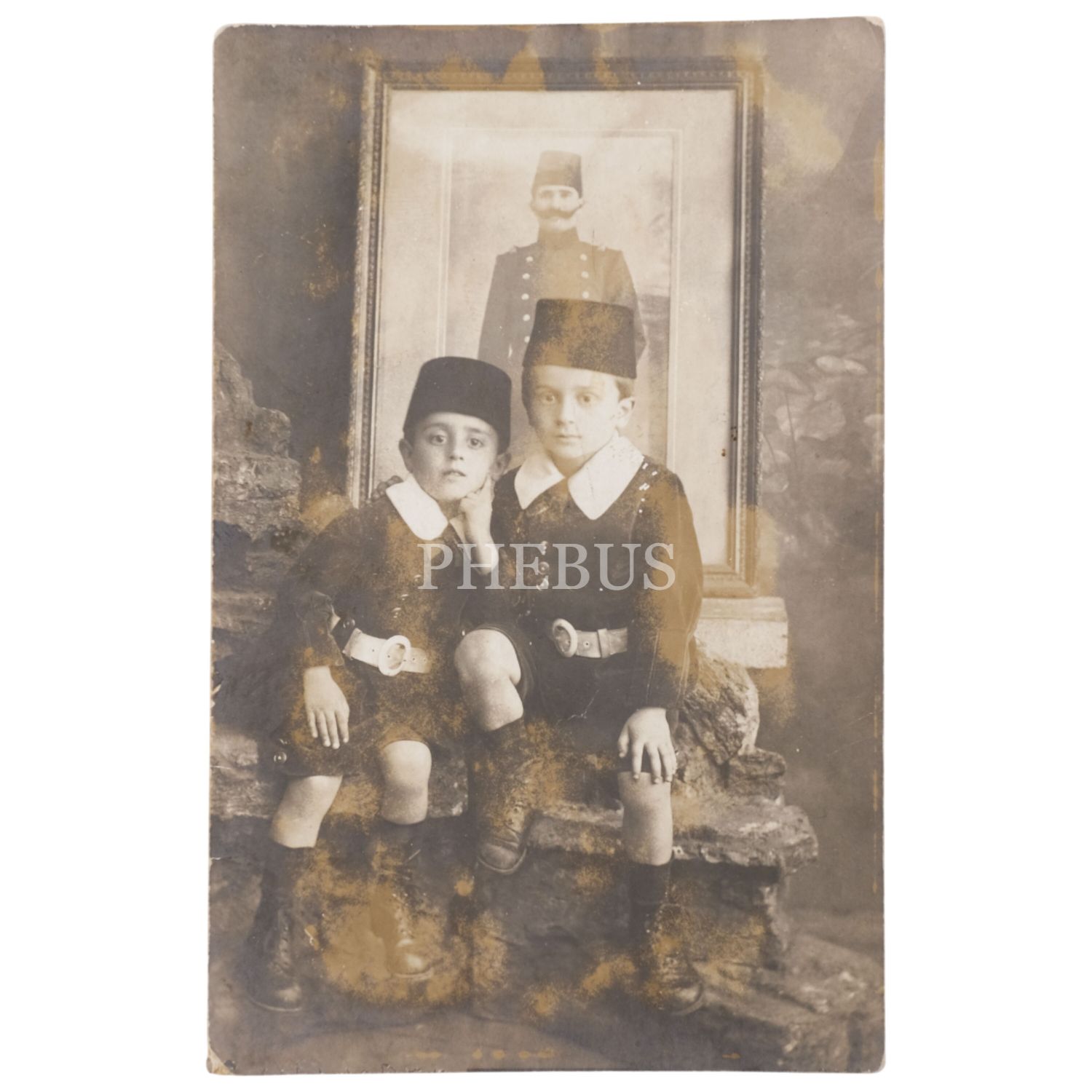 Resneli Niyazi Bey´in portre fotoğrafı önünde poz veren iki çocuğun stüdyo hatıra fotoğrafı, 9x14 cm...