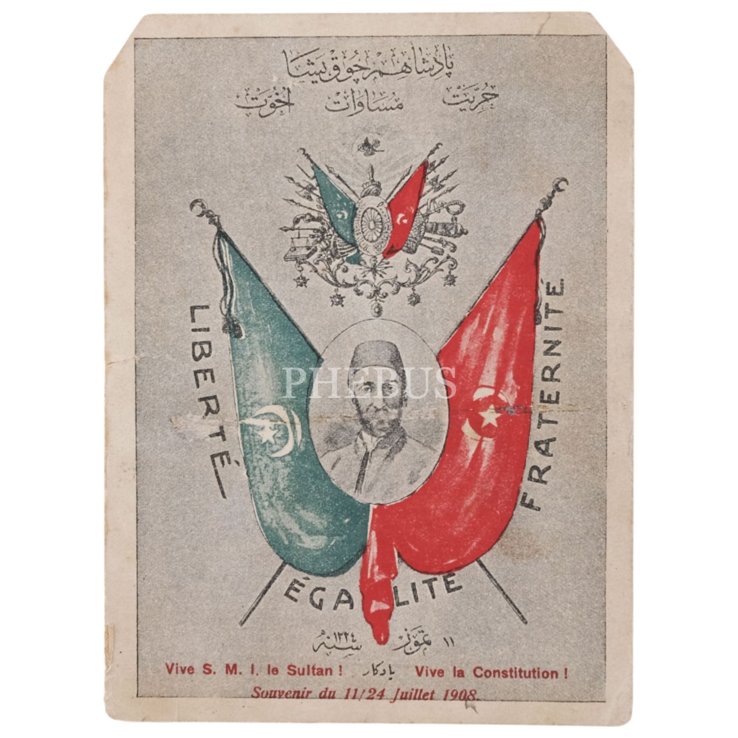 Sultan İkinci Abdülhamid´in fotoğrafının yer aldığı ve Meşrutiyet´in sloganı olan "Hürriyet, Musavaat ve Uhuvvet" yazılı kartpostal, 10x14 cm...