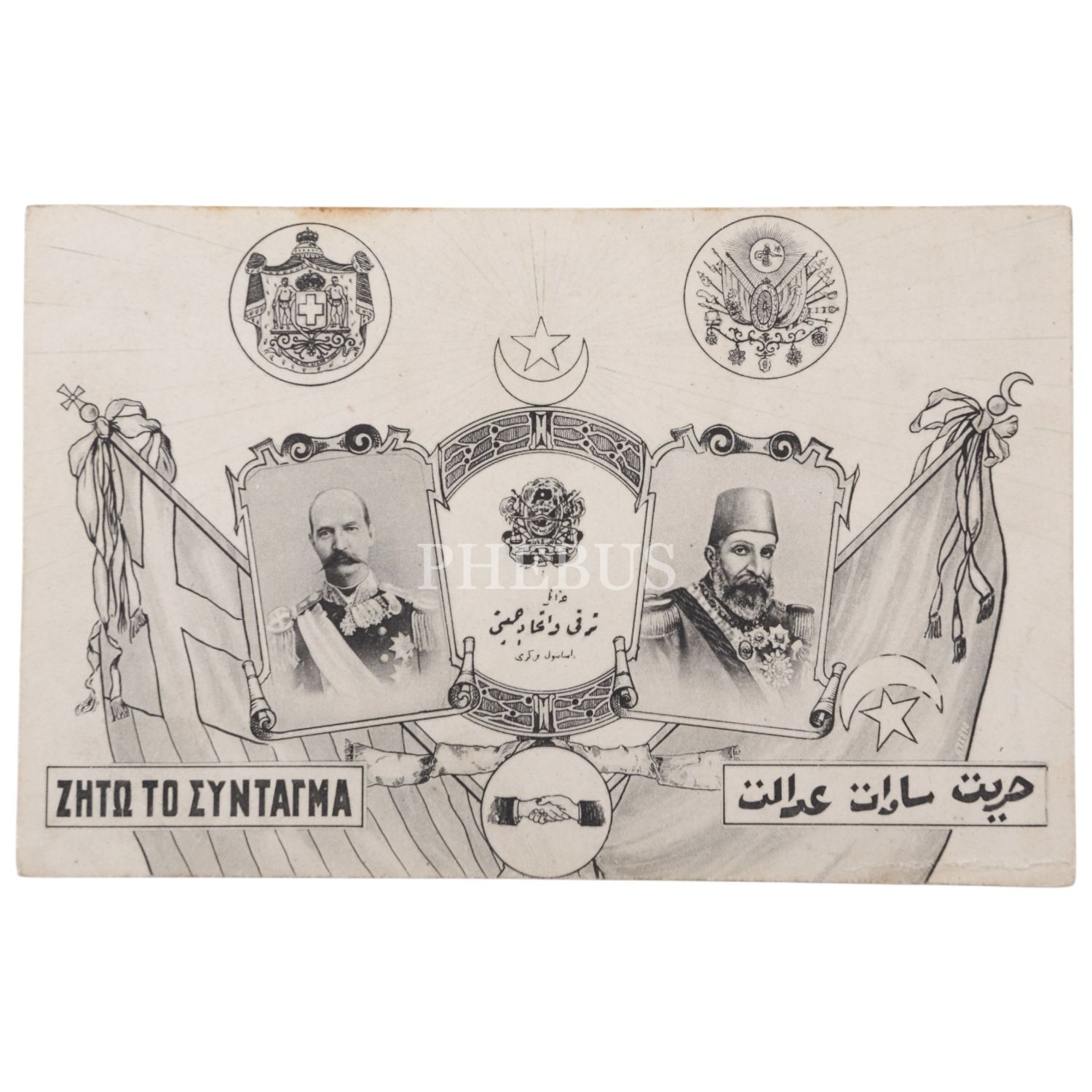 I. Konstantin ve II. Abdülhamid´in fotoğraflarının yer aldığı, İttihat ve Terakki Cemiyeti tarafından yayımlanan Meşrutiyet temalı kartpostal, Rumca ve Osmanlıca, 14x9 cm...