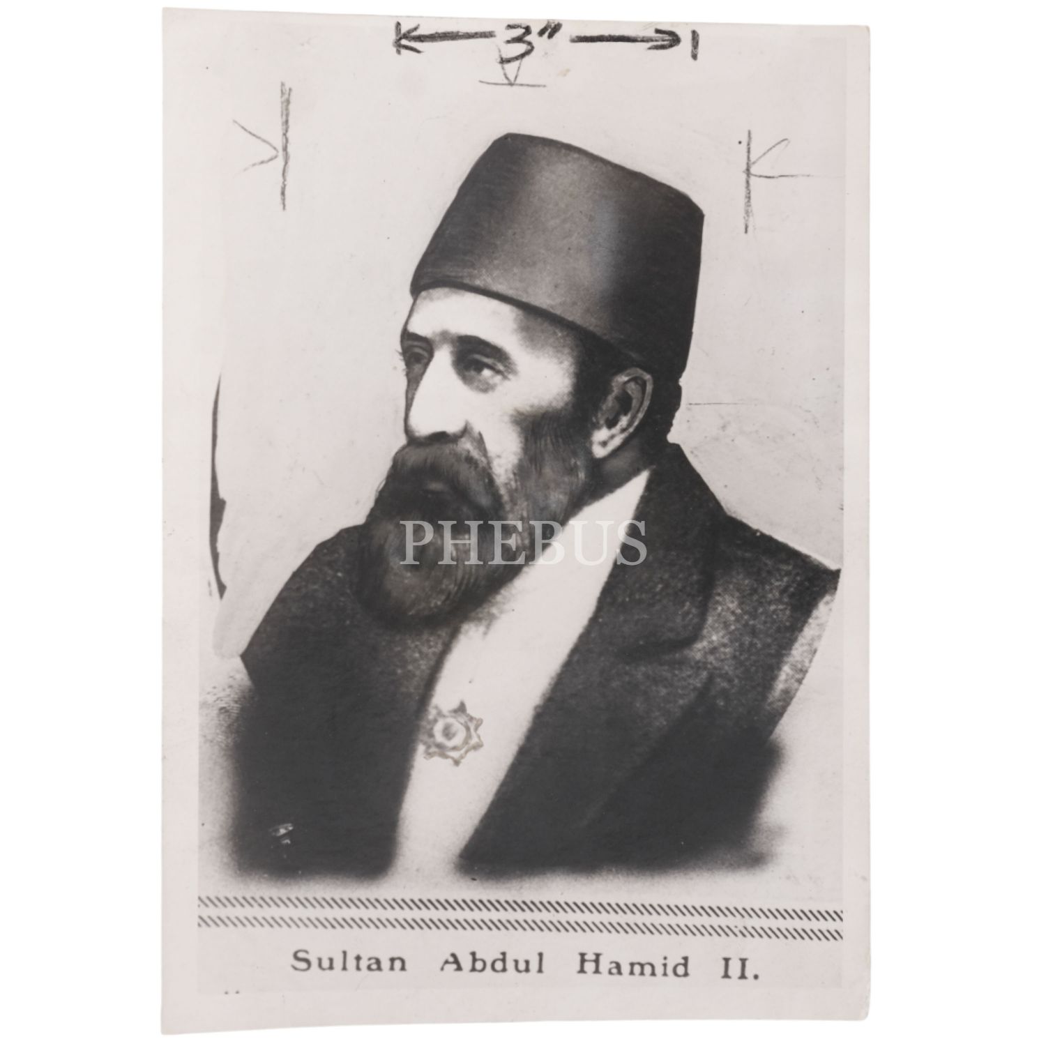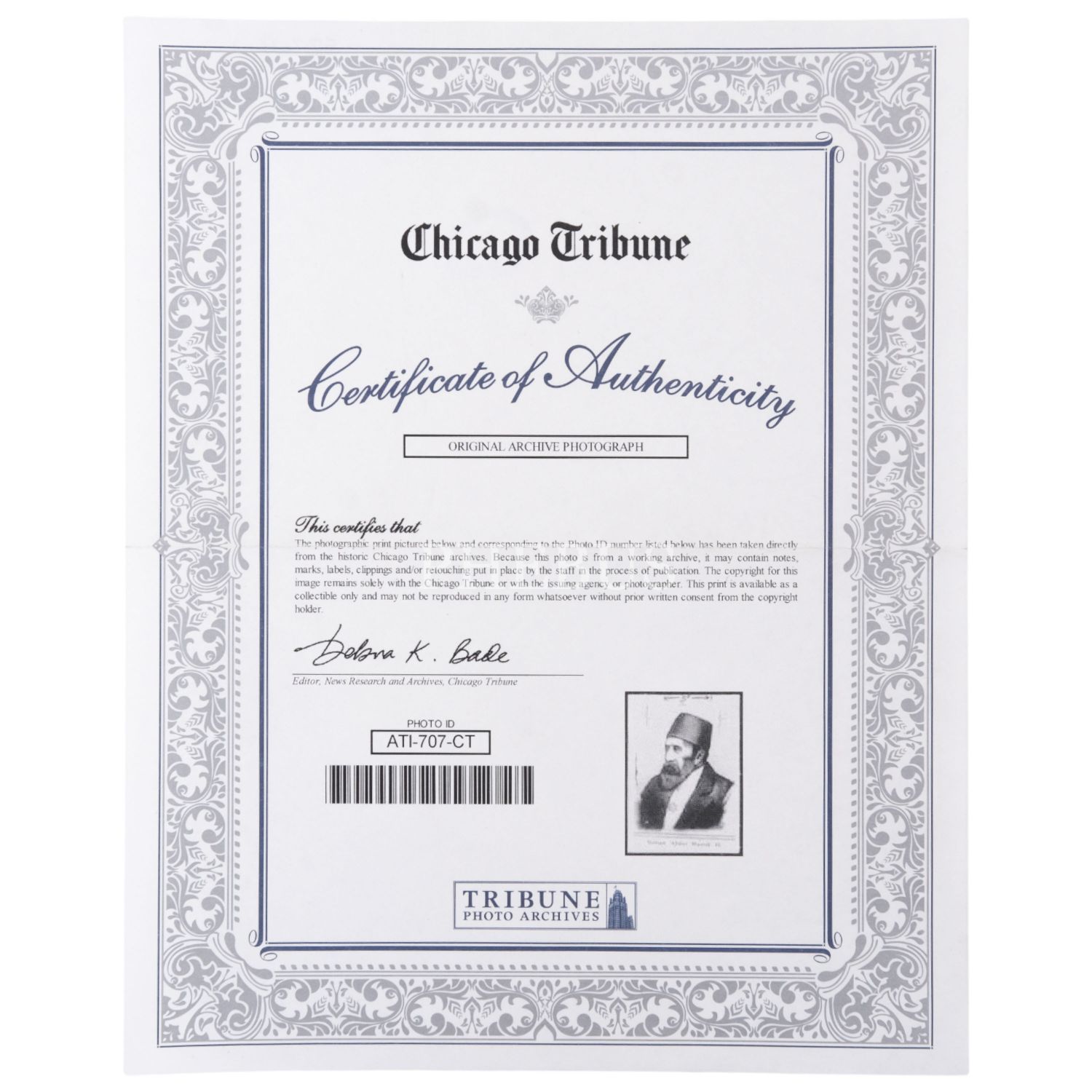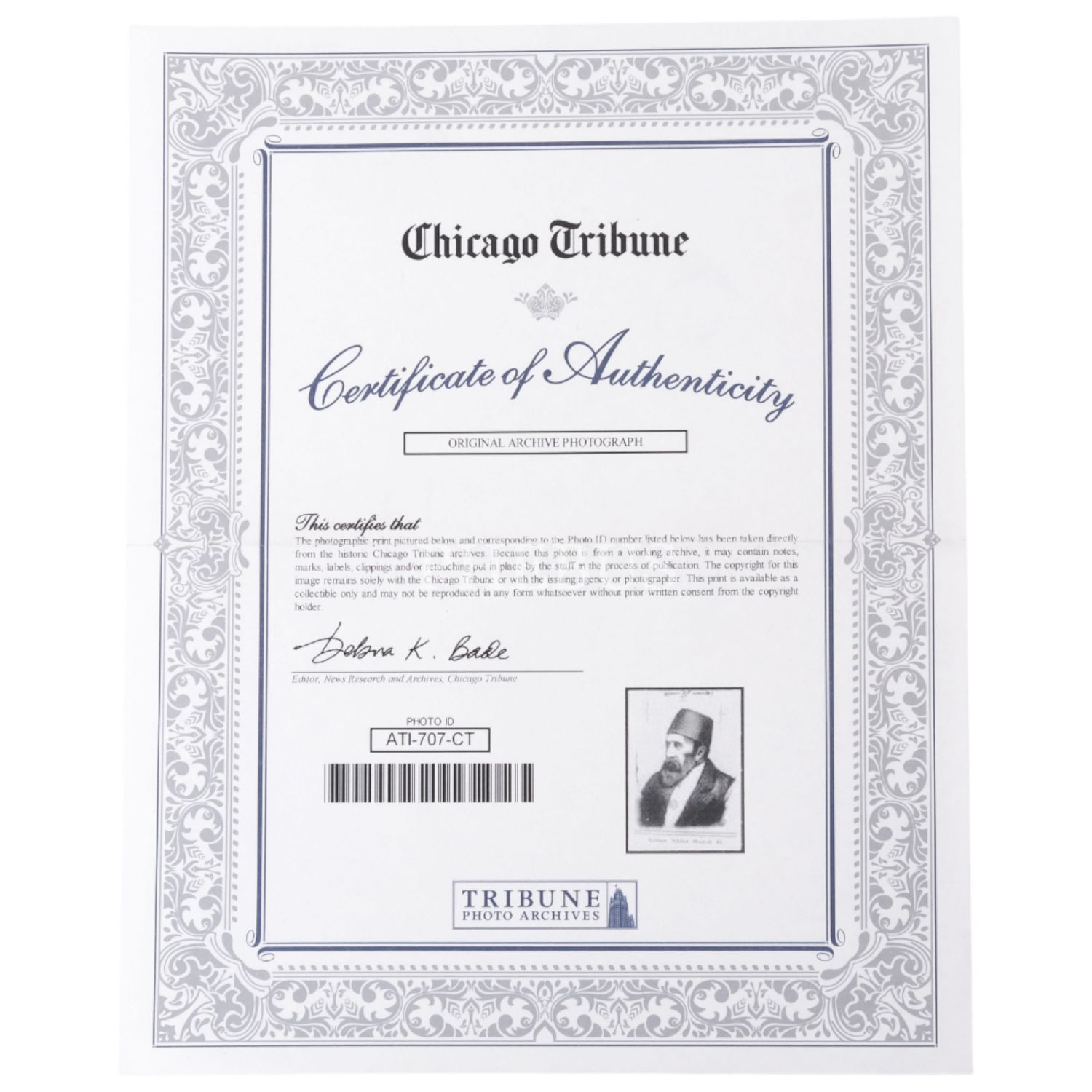 Sultan II. Abdülhamid´in, Amerikan günlük gazetesi Chicago Tribune´de yayımlanan bir haberde kullanılmış arşiv fotoğrafı ile fotoğrafın gazete arşivi tarafından hazırlanmış orijinallik sertifikası, fotoğraf 13x18 cm, sertifika 20,5x25,5 cm...