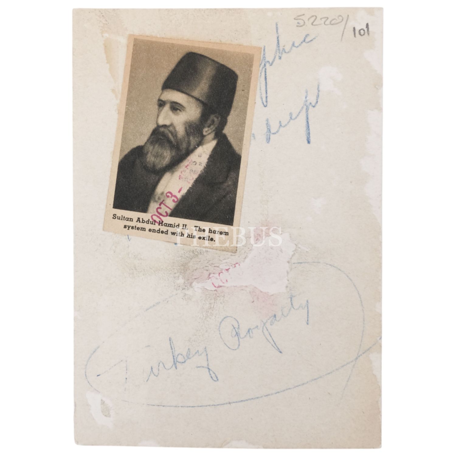 Fotoğrafın arka yüzüne, kullanıldığı haber kupürü yapıştırılmıştır: "Sultan Abdülhamid II. Harem sistemi onun sürgüne gönderilmesiyle sona erdi." (Sultan Abdul Hamid II. The harem system ended with his exile.)