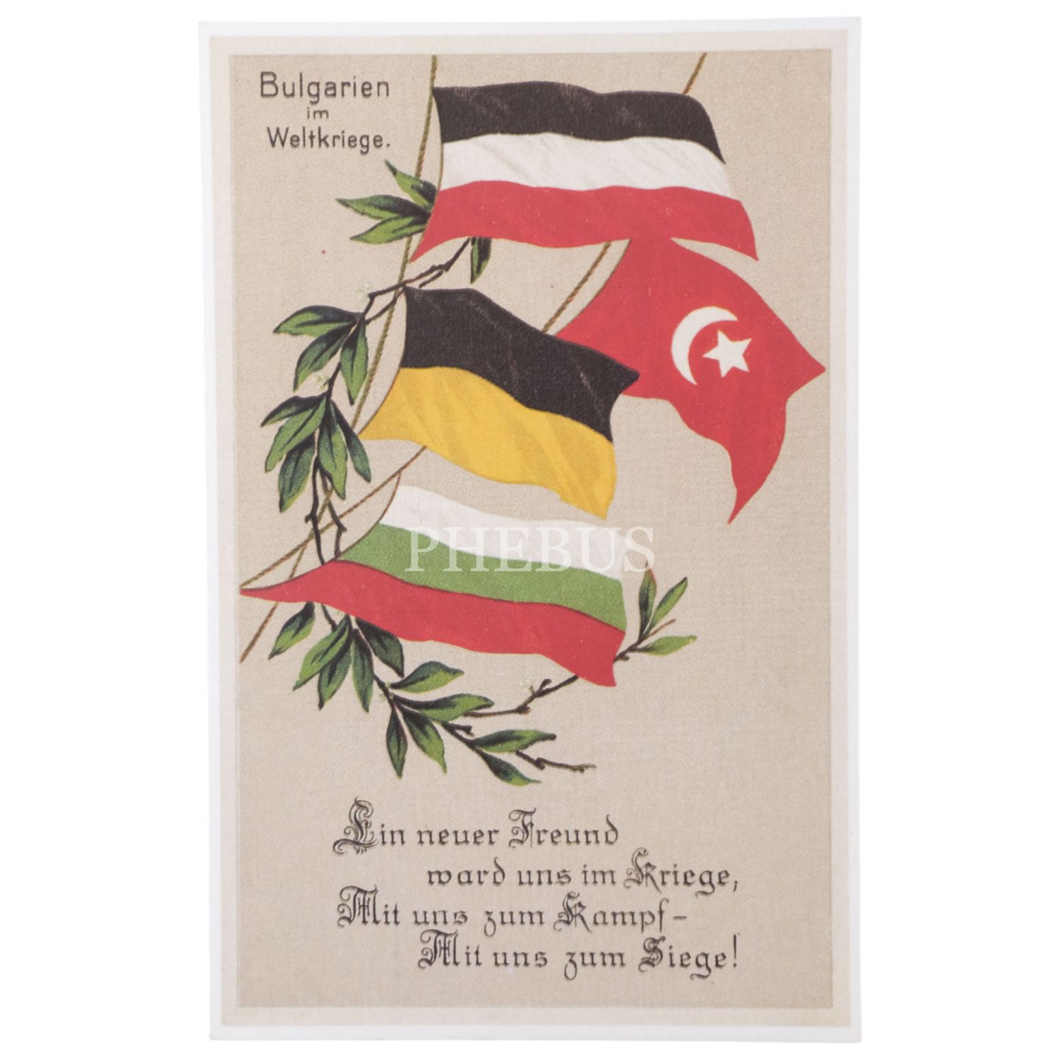 Propaganda yazılı İttifak kartpostalı, "Bulgarien im Weltkriege Ein neuer Freund ward uns im Kriege; Mit uns zum Kampf-Mit uns zum Siege!", 14x9 cm...