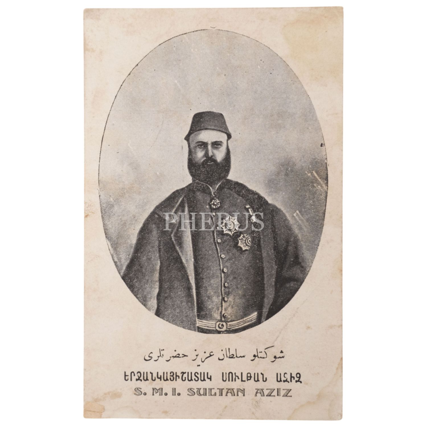 Sultan Abdülaziz´in tasvir edildiği, üç dilde (Osmanlıca, Ermenice ve Fransızca) "Şevketli Sultan Aziz Hazretleri" yazılı kartpostal, ed.: K. Papazian (Çiçekpazarı), 9x14 cm...