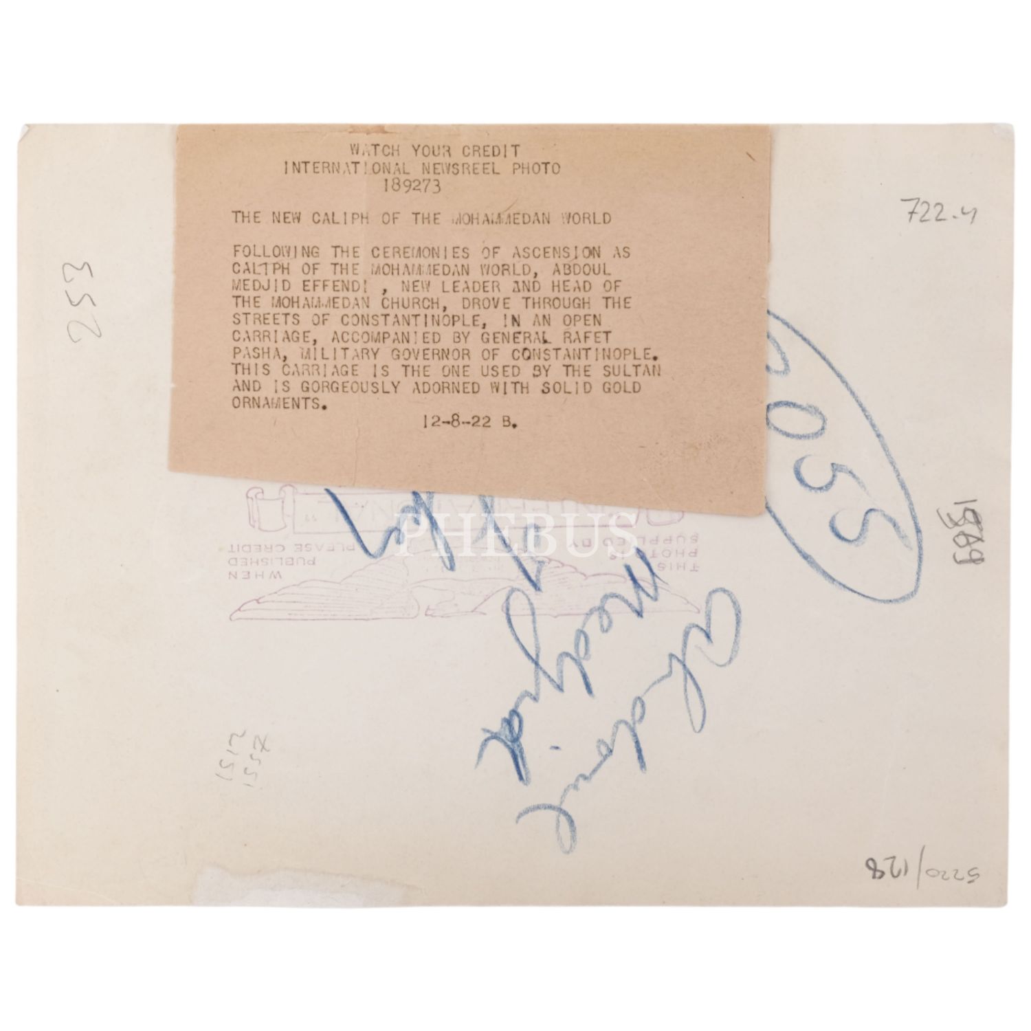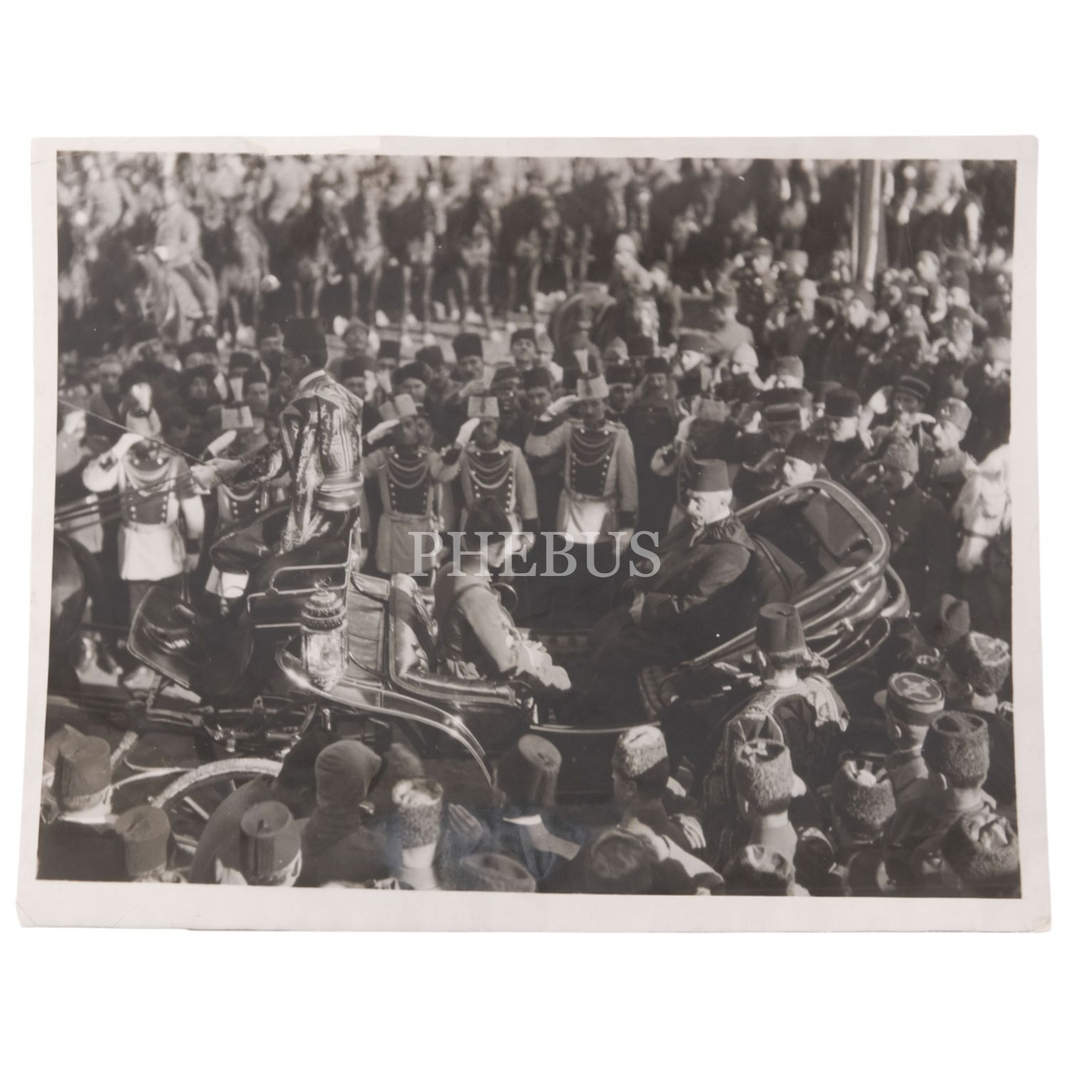 Son Halife Abdülmecid Efendi´nin, biat merasiminin ardından, İstanbul Askeri Valisi Refet (Bele) Paşa eşliğinde araba ile İstanbul sokaklarında dolaşırken görüldüğü basın arşivi fotoğrafı, arka yüzü "International" (New York) damgalı ve İngilizce açıklama bantlı, 25x20 cm...