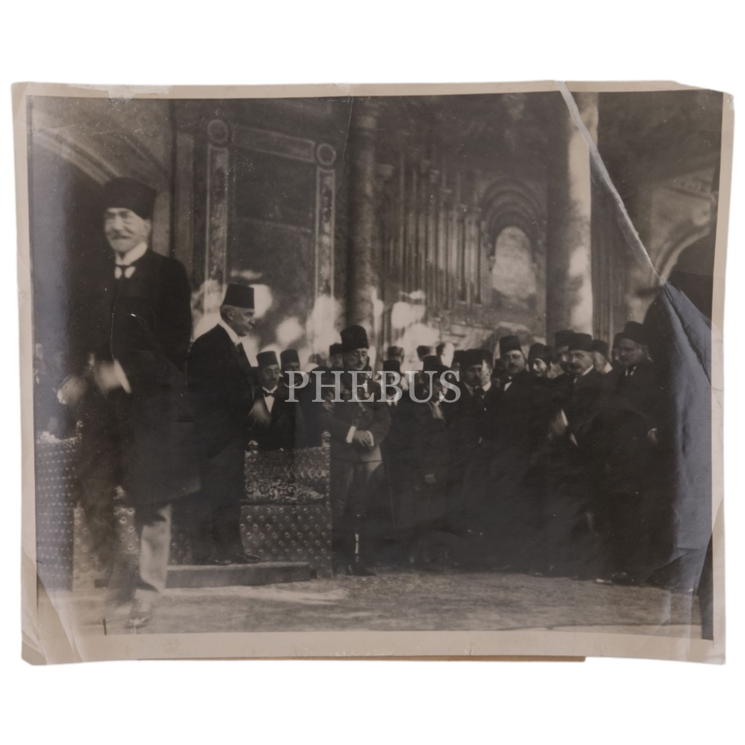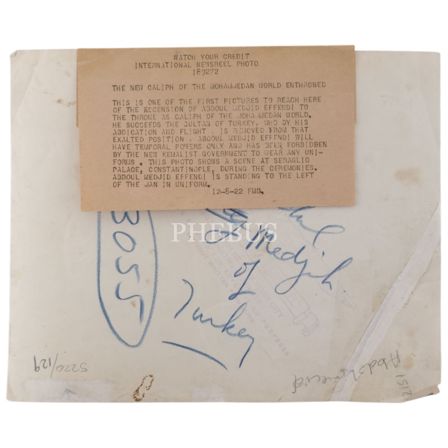 Son Halife Abdülmecid Efendi´nin biat merasiminden bir ânı gösteren basın arşivi fotoğrafı, arka yüzü "International" (New York) damgalı ve İngilizce açıklama bantlı, 25x20 cm...