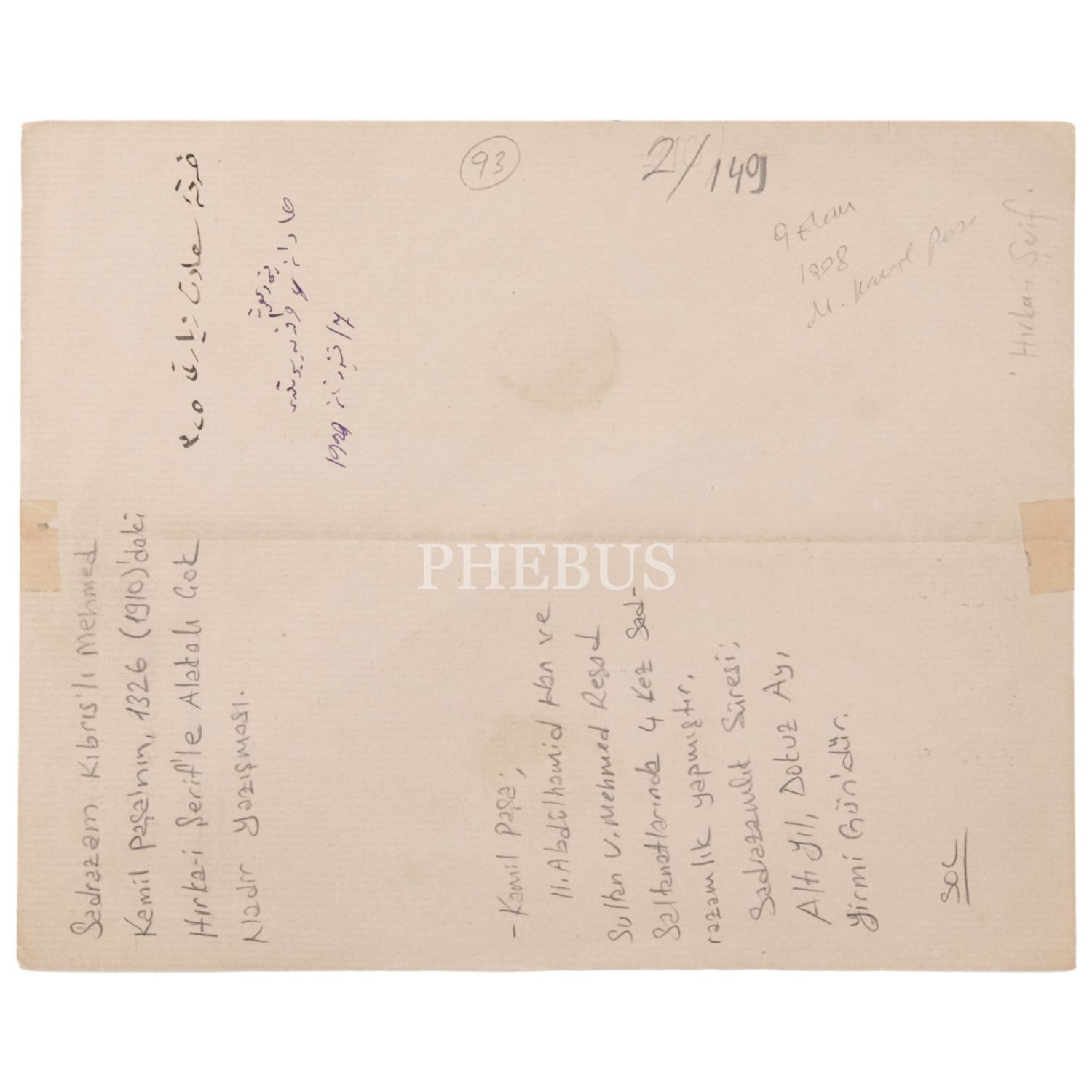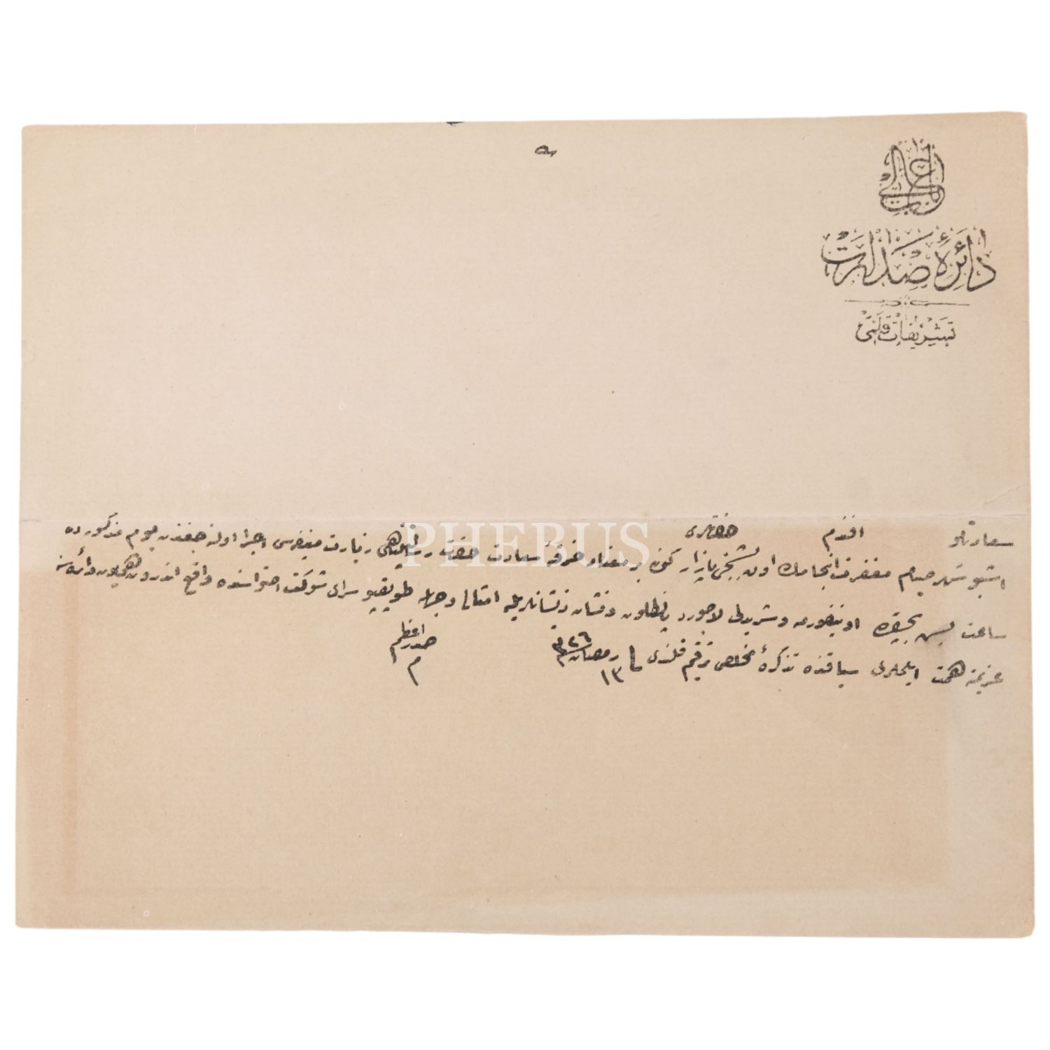 Hırka-i Saadet Dairesi´ne ziyaret için Bab-ı Ali Daire-i Sadaret´ten gönderilen Sadrazam Kamil Paşa´dan imzalı davetiye, 1908, 23x19 cm...