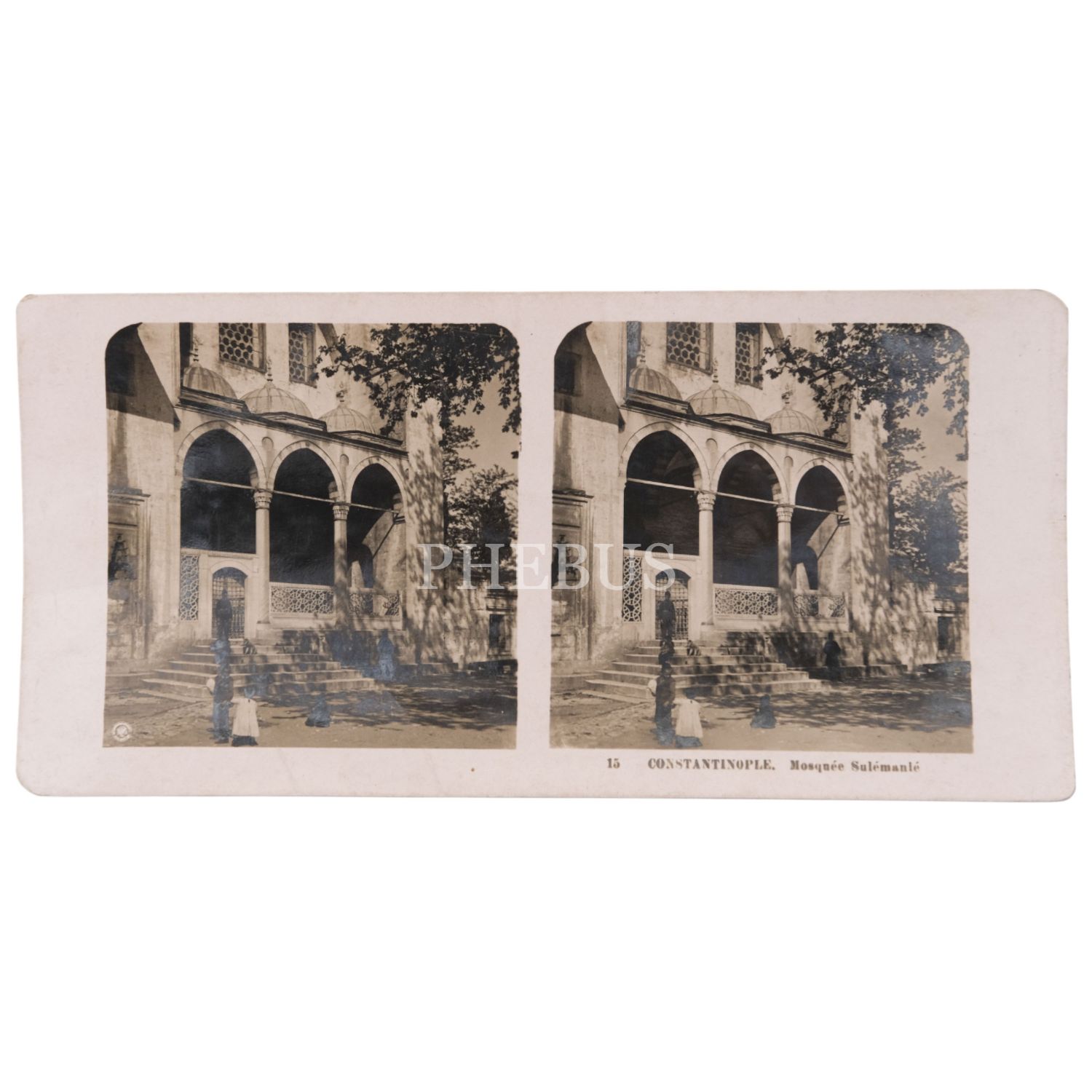 Süleymaniye Camii görselli stereoview kart, "Constantinople - Mosquee Sulemanie", 17,5x9 cm...