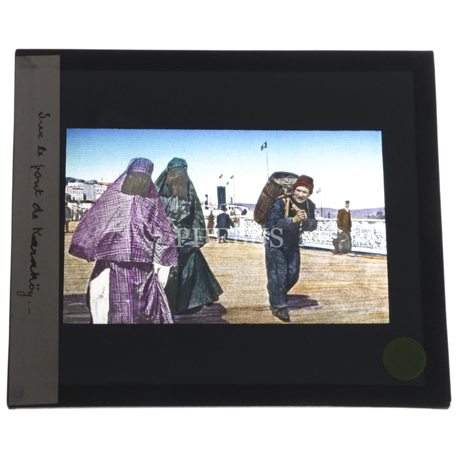 Osmanlı döneminden, Galata Köprüsü üzerinde hamal ve Türk kadınları görselli pozitif cam slayt, 10x8,5 cm...
