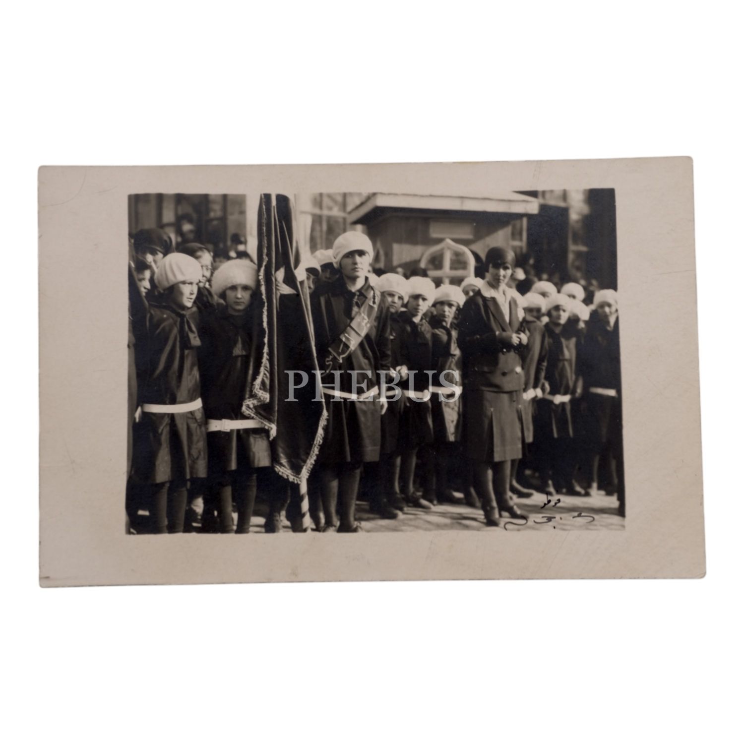 1926 senesi Cumhuriyet Bayramı kutlamalarında bir kız lisesi öğrencileri ve öğretmenleri, 14x9 cm...