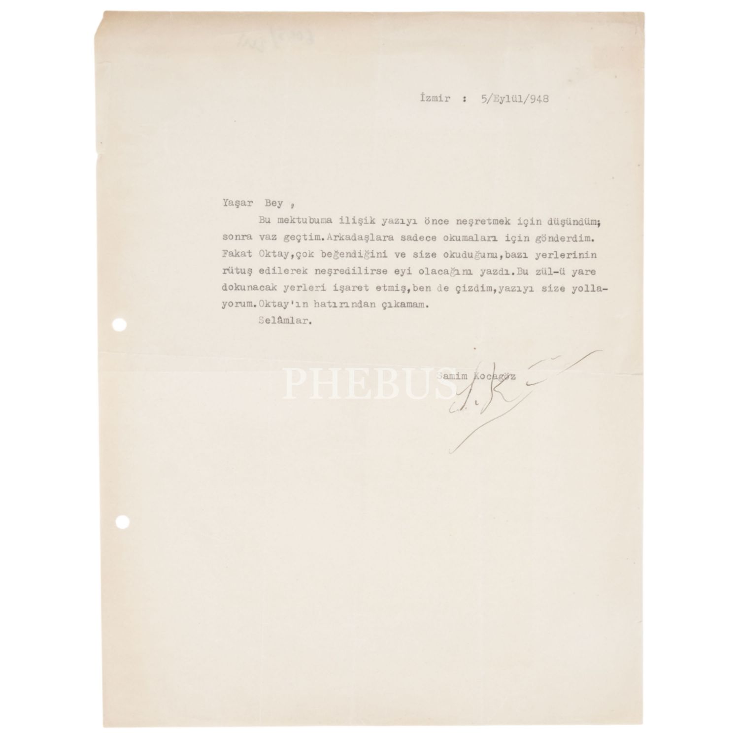 "Yaşar Bey, Bu mektubuma ilişik yazıyı önce neşretmek için düşündüm; sonra vaz geçtim. Arkadaşlara sadece okumaları için gönderdim. Fakat Oktay, çok beğendiğini ve size okuduğunu, bazı yerlerinin rütuş edilerek neşredilirse eyi olacağını yazdı. Bu zül-ü yare dokunacak yerleri işaret etmiş, ben de çizdim, yazıyı size yollayorum. Oktay´ın hatırından çıkamam. Selâmlar. Samim Kocagöz"