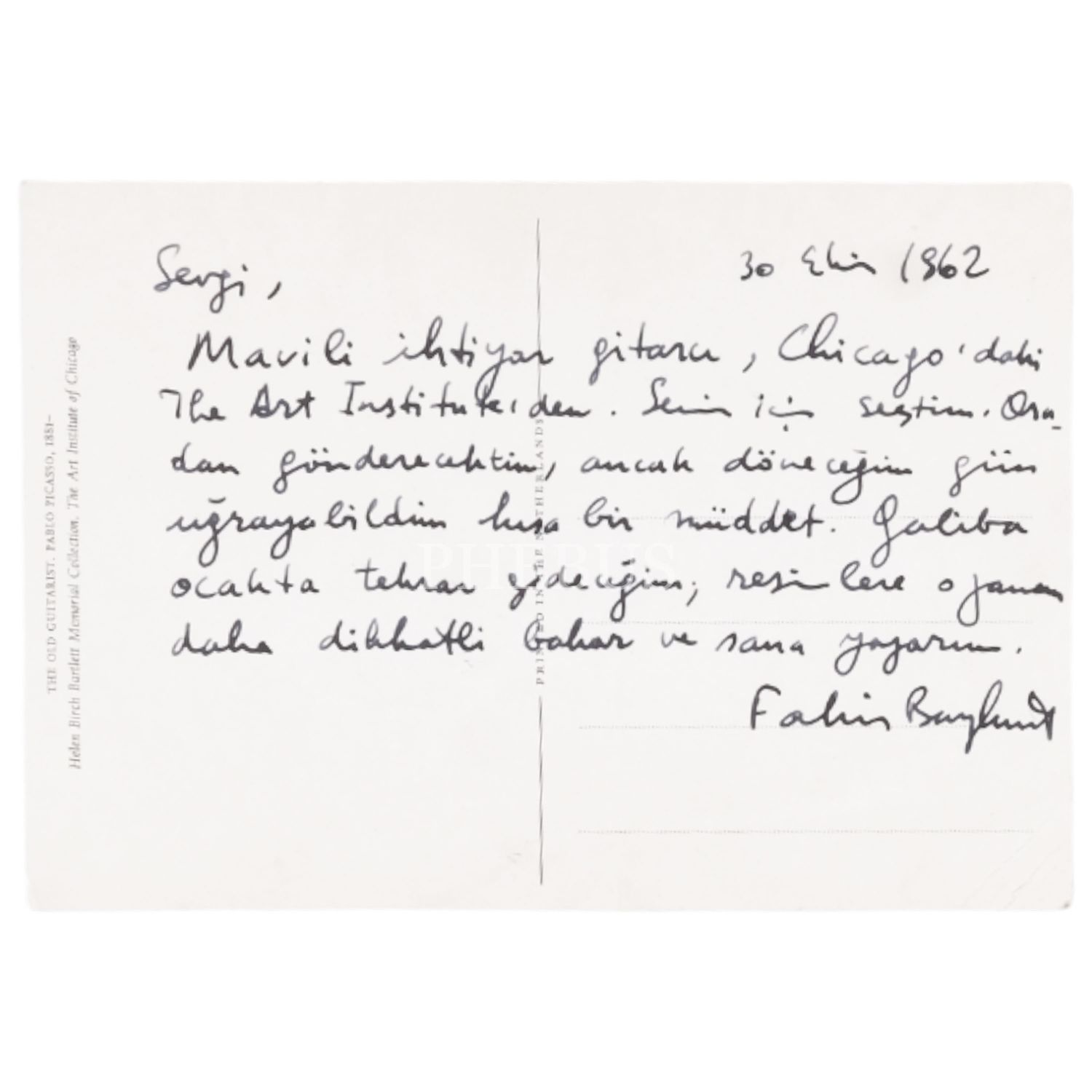 "Sevgi, Mavili İhtiyar Gitarcı, Chicago´daki The Art Institute´den. Senin için seçtim. Oradan gönderecektim, ancak döneceğim gün uğrayabildim kısa bir müddet. Galiba ocakta tekrar gideceğim; resimlere o zaman daha dikkatli bakar ve sana gönderirim. Fakir Baykurt."