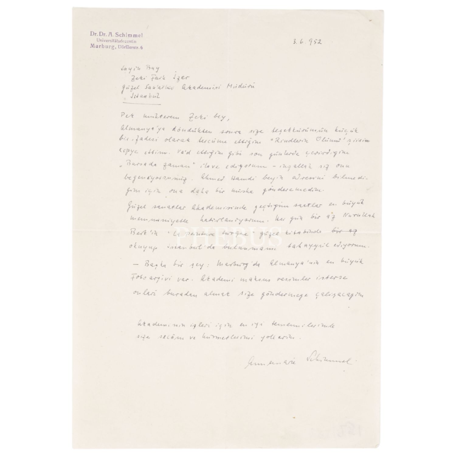 İslam ve Orta Doğu üzerine sayısız incelemesiyle tanınan Annemarie Schimmel´in, İstanbul Devlet Güzel Sanatlar Akademisi Müdürü Zeki Faik İzer´e hitaben kaleme aldığı el yazısı mektup, 3 Haziran 1952, 21x30 cm...