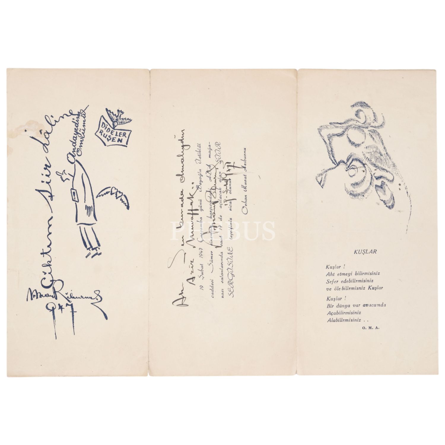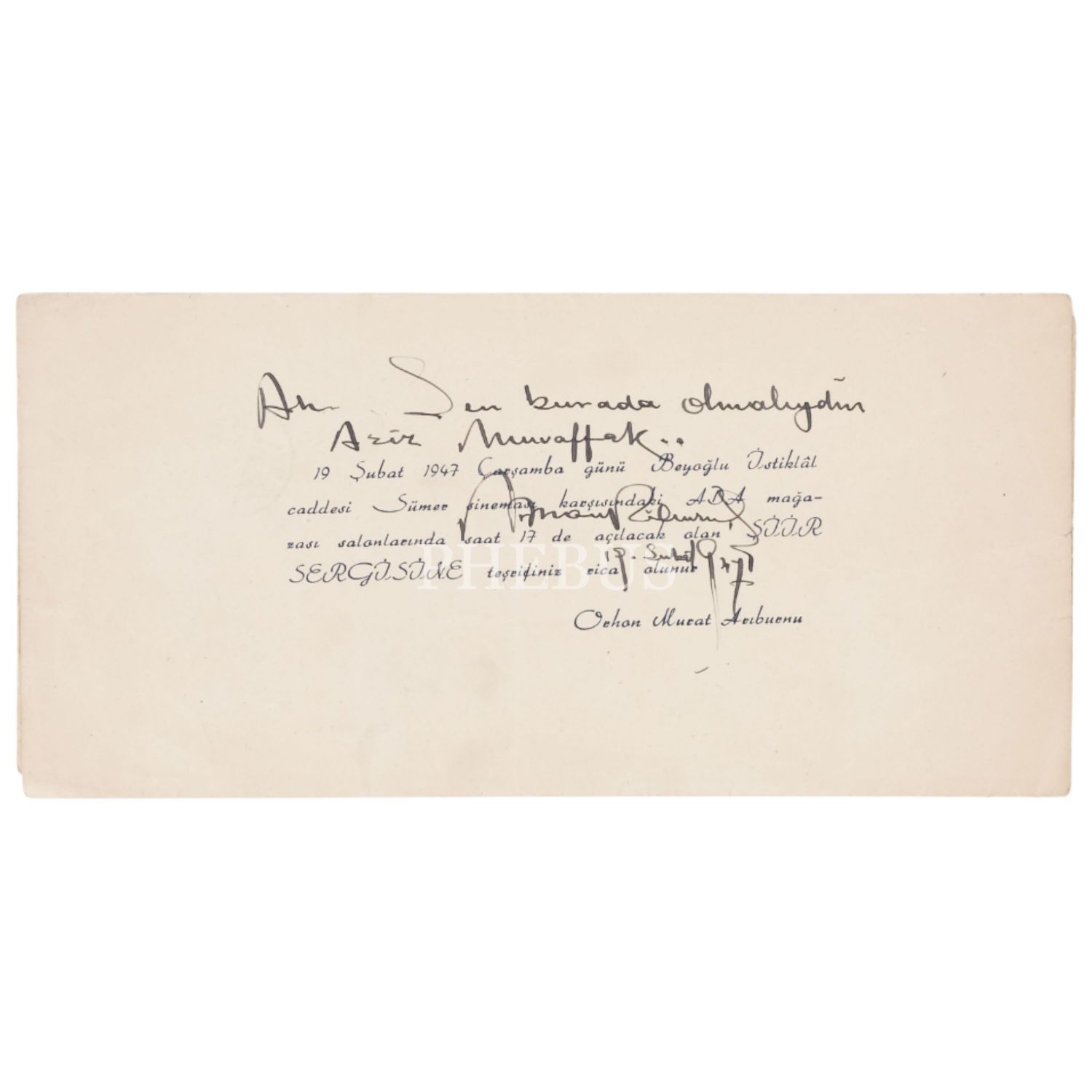 Orhan Murat Arıburnu´nun "Ah sen burada olmalıydın Aziz Muvaffak..." notu düşerek imzaladığı "Şiir Sergisi" davetiyesi, 1947, (açık halde) 35,5x25,5 cm...
