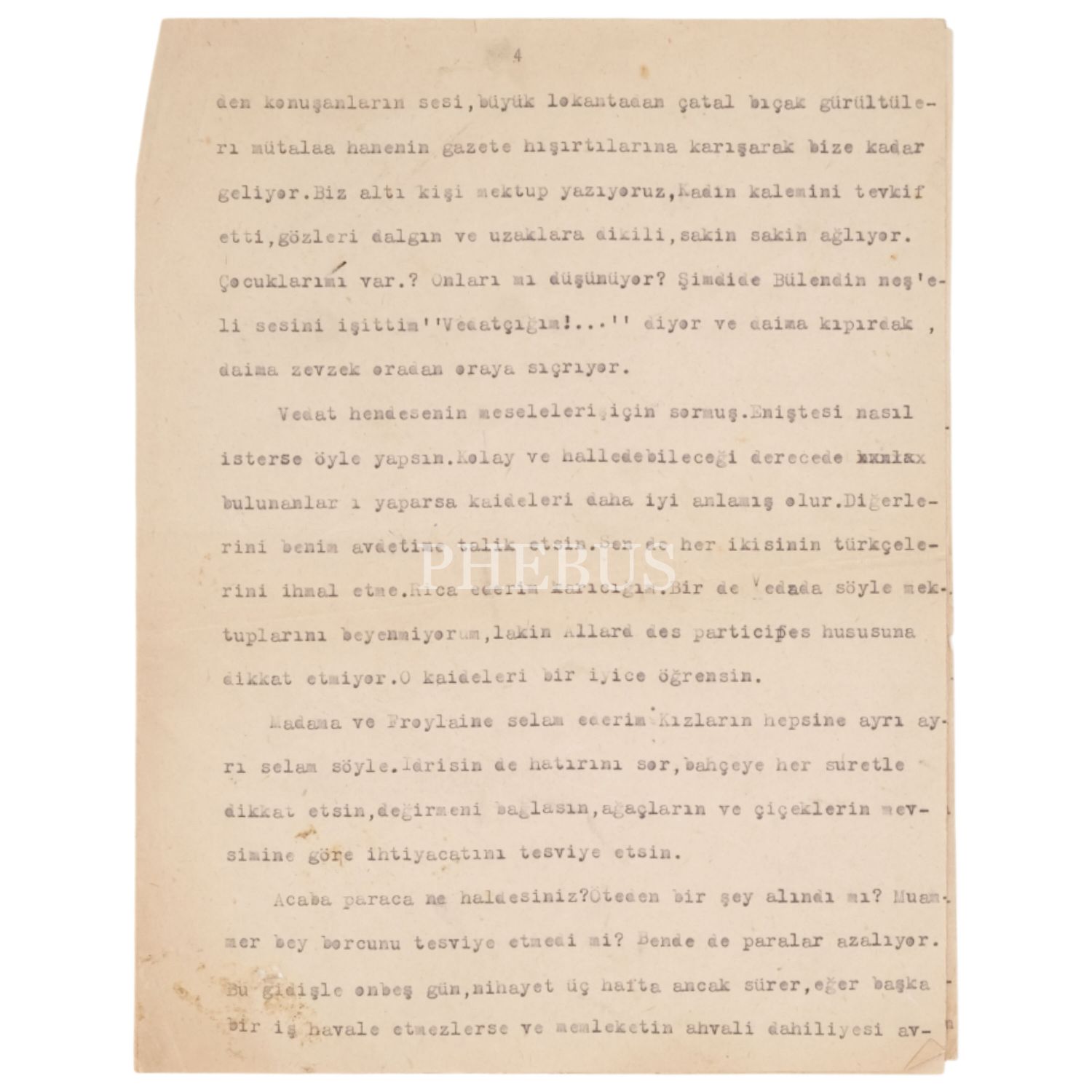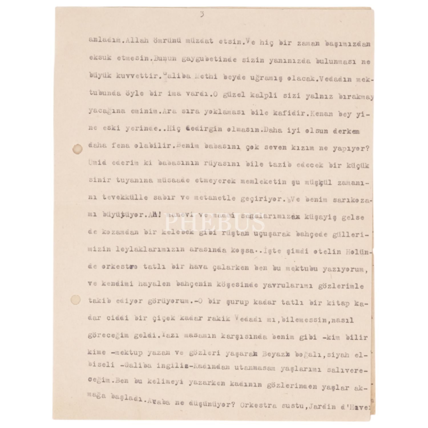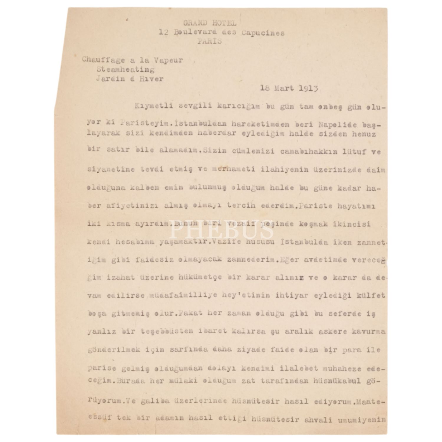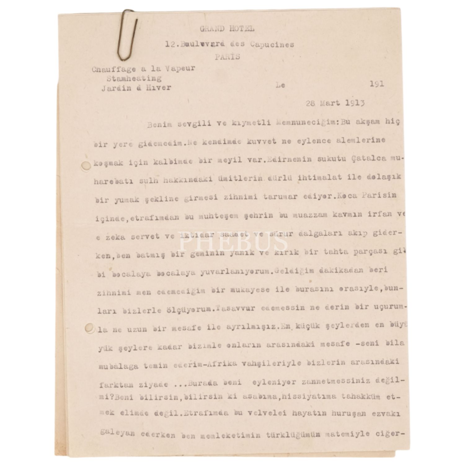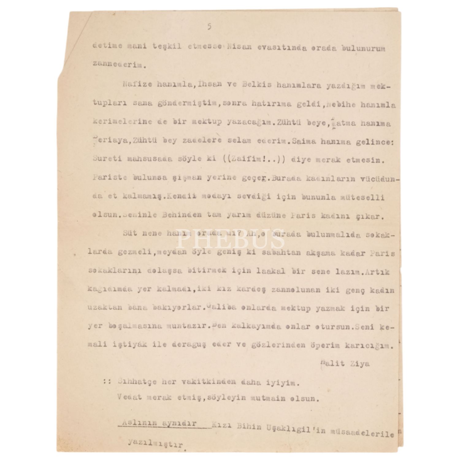 Halid Ziya Uşaklıgil´in, 1913 yılında Paris´ten eşi Fatma Memnune Hanım´a gönderdiği mektubun, kızı Bihin Uşaklıgil´in müsaadesiyle "aslının aynı" olarak yeni harflerle hazırlanmış daktilo metni, 5+1 sayfa, 18x22 cm...