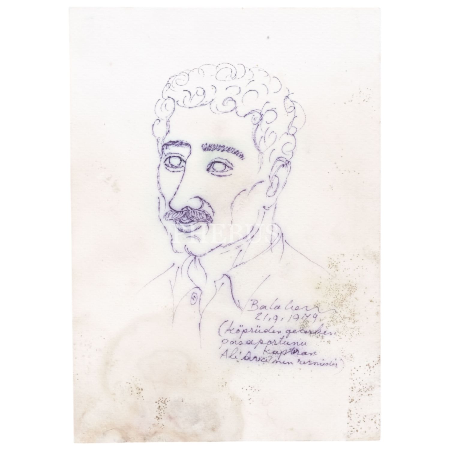 İbrahim Balaban´dan ıslak imzalı portre resim, "Köprüden geçerken pasaportunu kaptıran Ali Avcı´nın resmidir." açıklamalı, 21 Eylül 1979 tarihli, kâğıt üzerine tükenmez kalem, 17x24 cm...