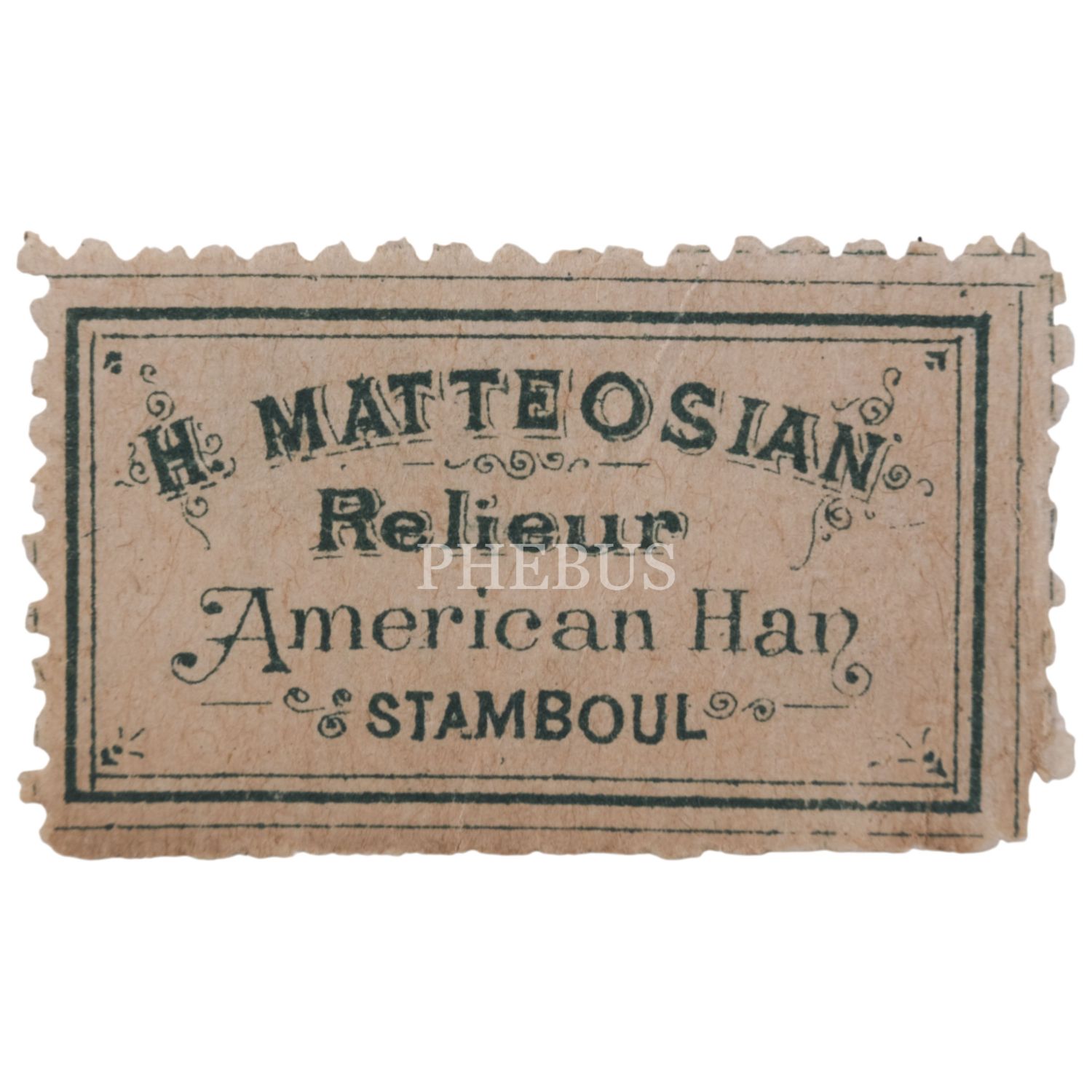 İstanbul, Amerikan Han içinde bulunan Ermeni mücellit H. Matteosian´ın iki adet kitap etiketi, "H. Matteosian - Relieur - American Han, Stamboul", 3x1,5 cm...