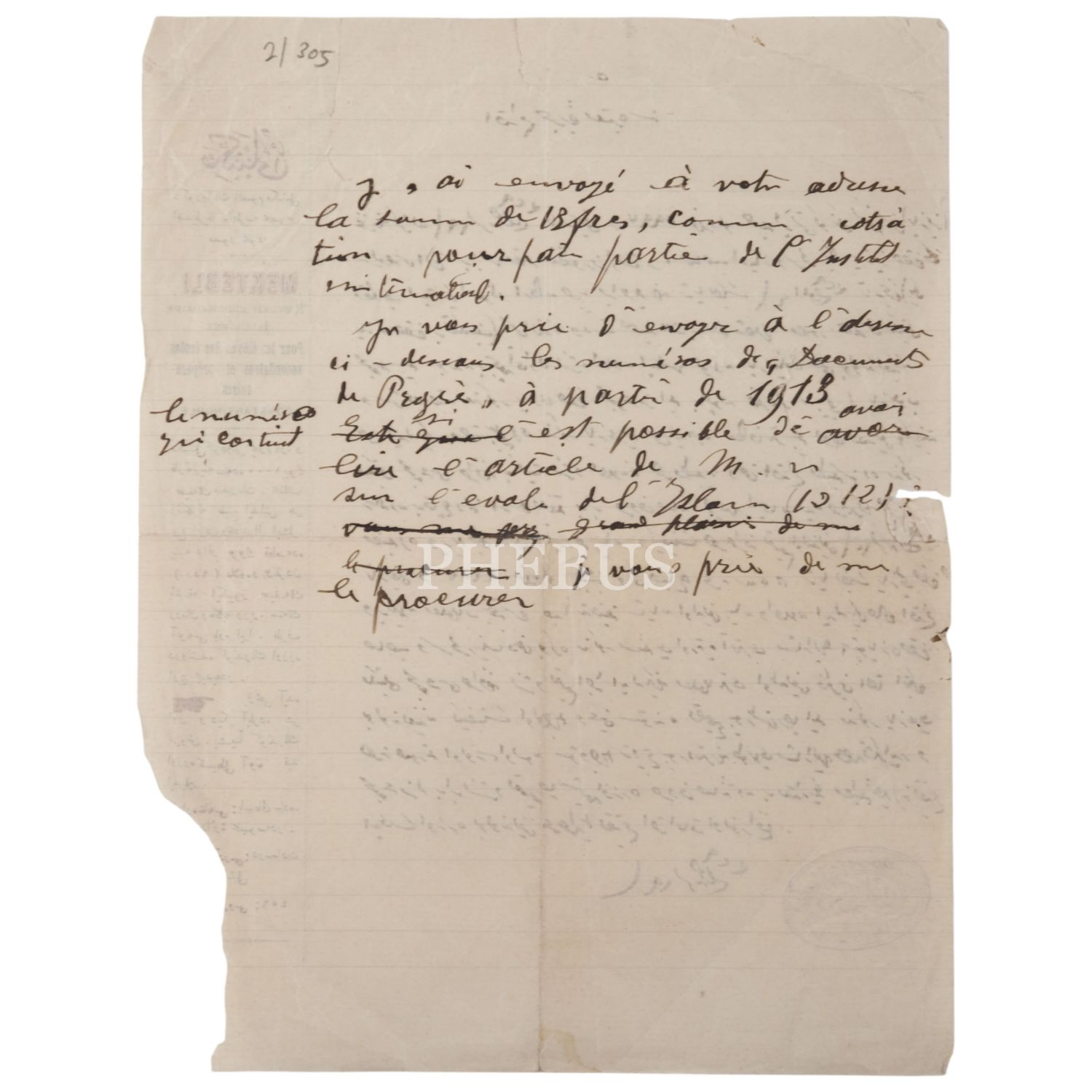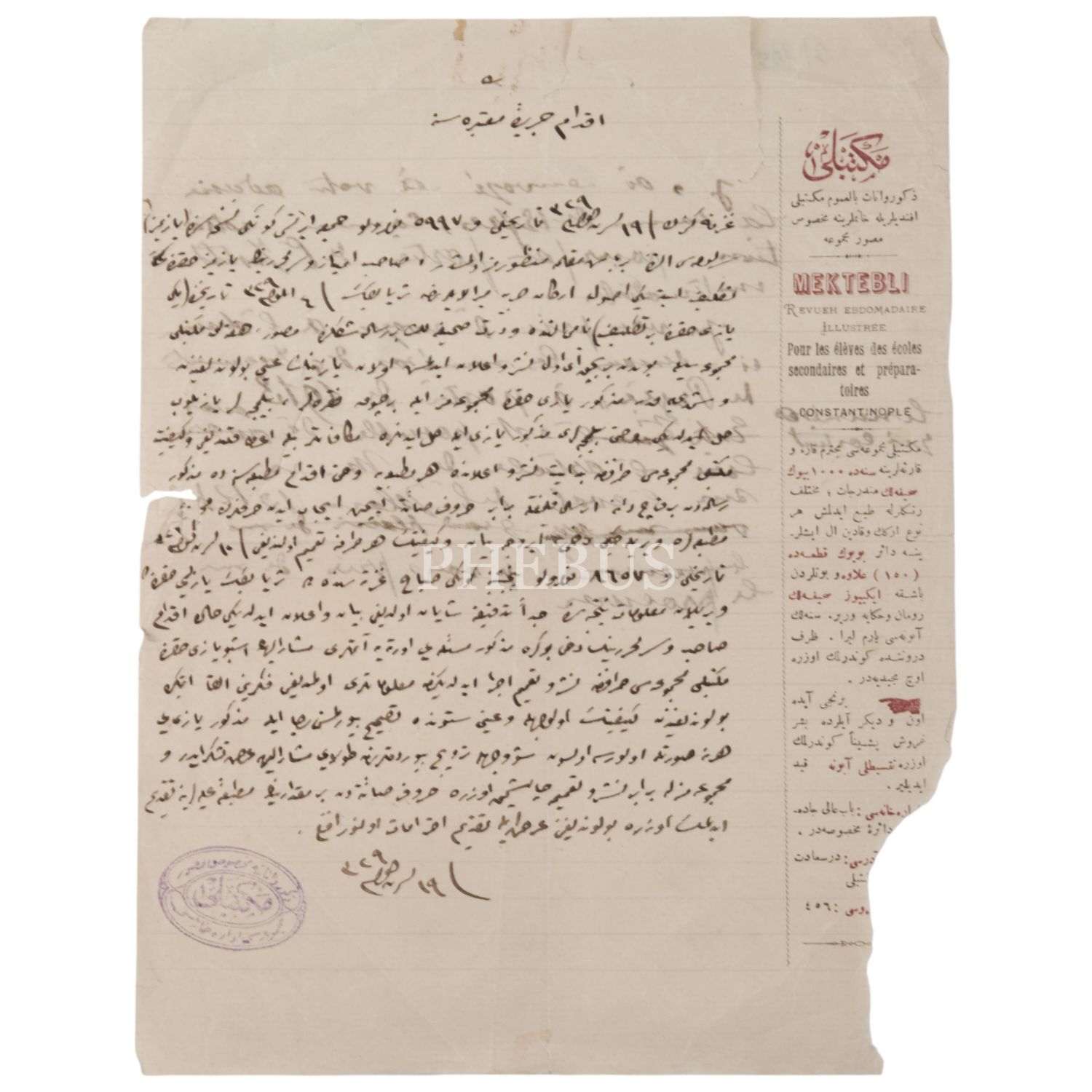 Mektepli Mecmuası tarafından İkdam Matbaası´na yazılan bir yazı, 1329, 21x27 cm...