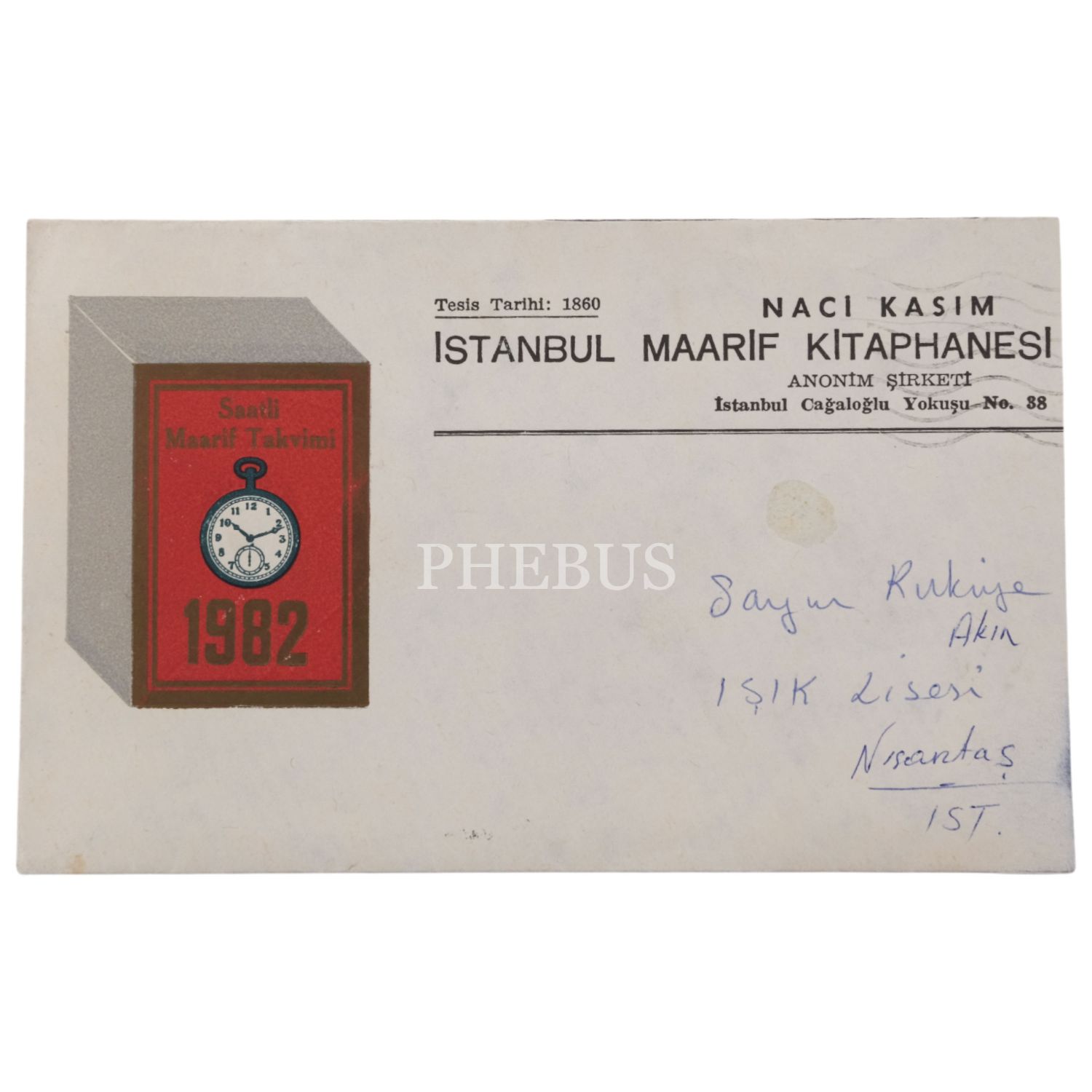 İstanbul Maarif Kitaphanesi Anonim Şirketi (Naci Kasım) antetli boş zarf, 1982, 17x10 cm..