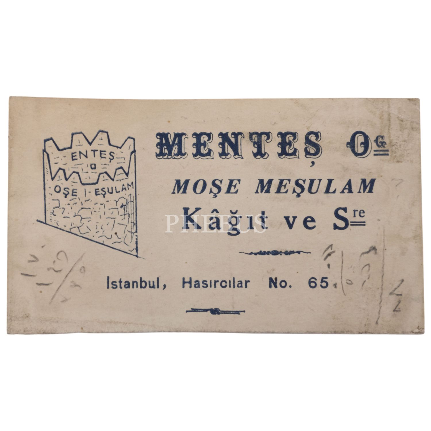 "Menteş - Moşe Meşulam Kâğıt ve Sre (İstanbul, Hasırcılar No. 65)" yazılı işyeri kartı, 12,5x7 cm...