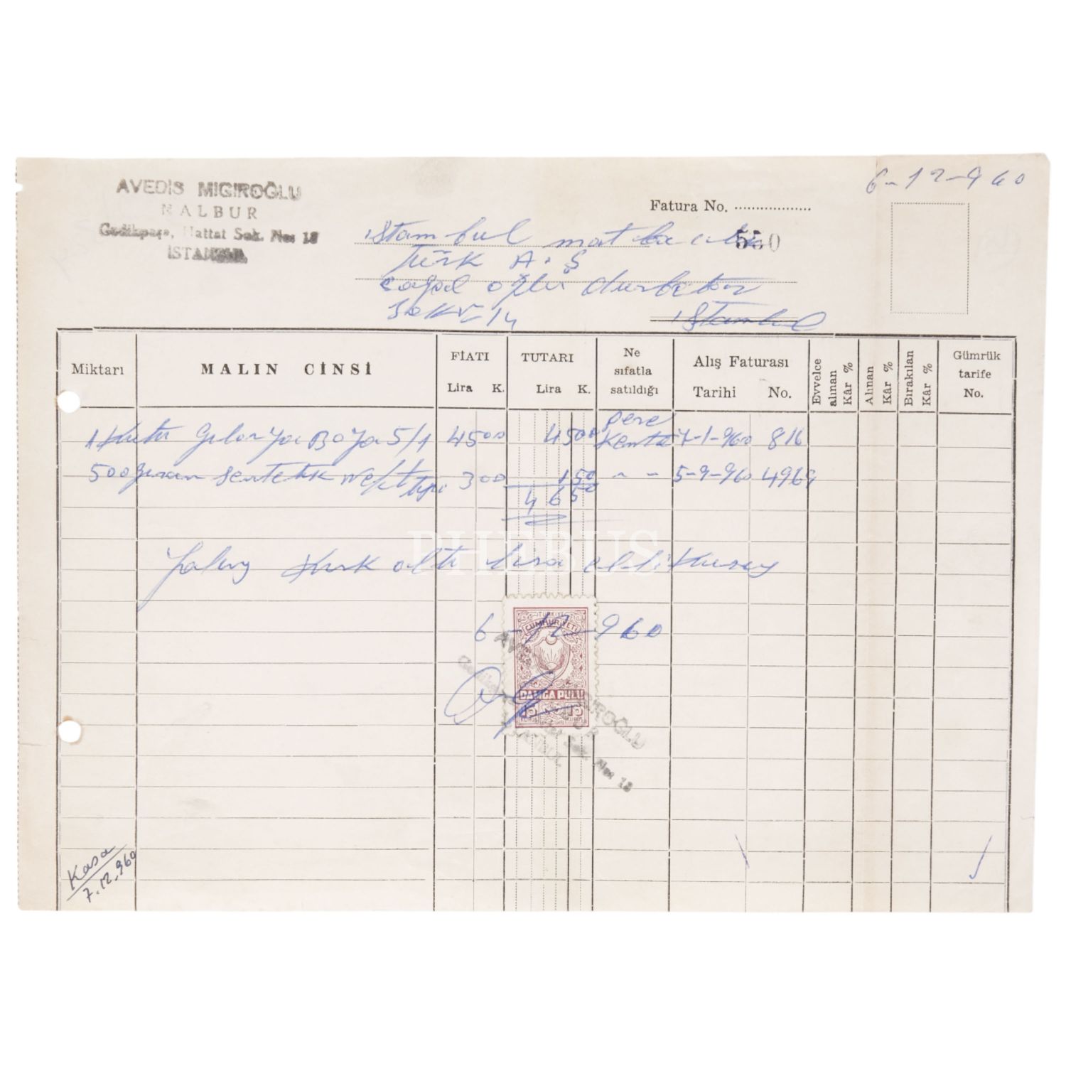 "Avedis Mıgıroğlu - Nalbur / Gedikpaşa, İstanbul" damgalı, 6 Aralık 1960 tarihli fatura, 25x18 cm...