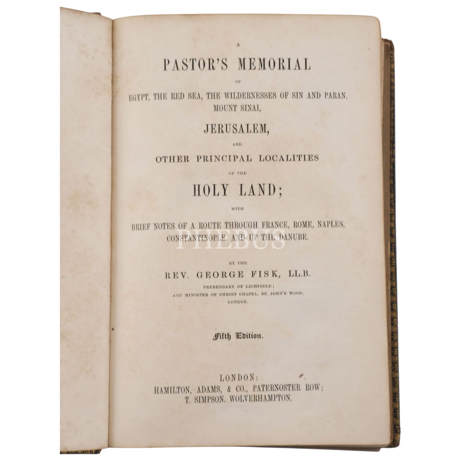 Deri cildinde. Kitabın ilk baskısı 1843 tarihlidir. Kitabın bazı baskıları A memorial of Egypt, the Red Sea, the wildernesses of Sin and Paran, Mount Sinai, Jerusalem, and other principal localities of the Holy Land, visited in 1842 başlığı ile basılmıştır. George Fisk 1842 yılında 8 ay süreyle bölgeyi dolaştı. Kitabın büyük bir bölümünü Kutsal Topraklar’daki izlenimlerine ayrıran Fisk dönüş yolunda Kıbrıs, Rodos, İzmir üzerinden İstanbul’a gelmiş, gezinin bu bölümünü de etraflıca anlatmıştır. Blackmer 595 (2. baskı)