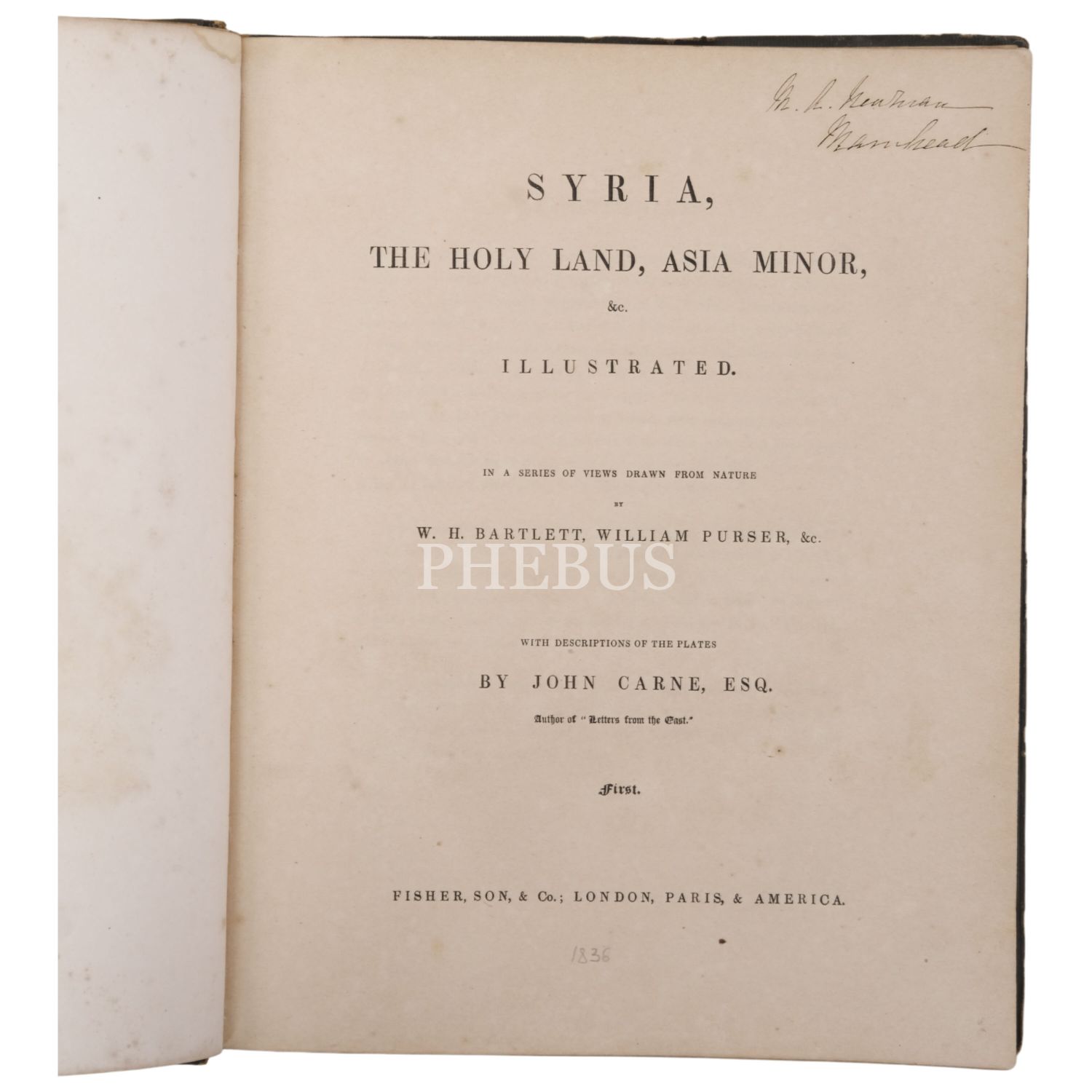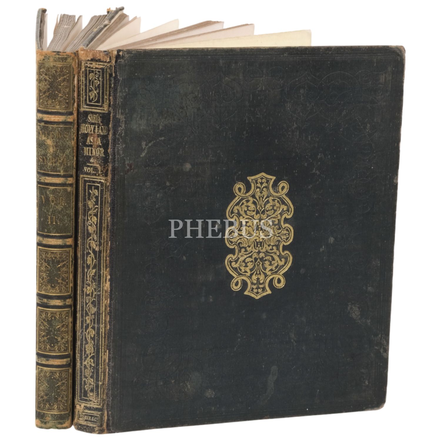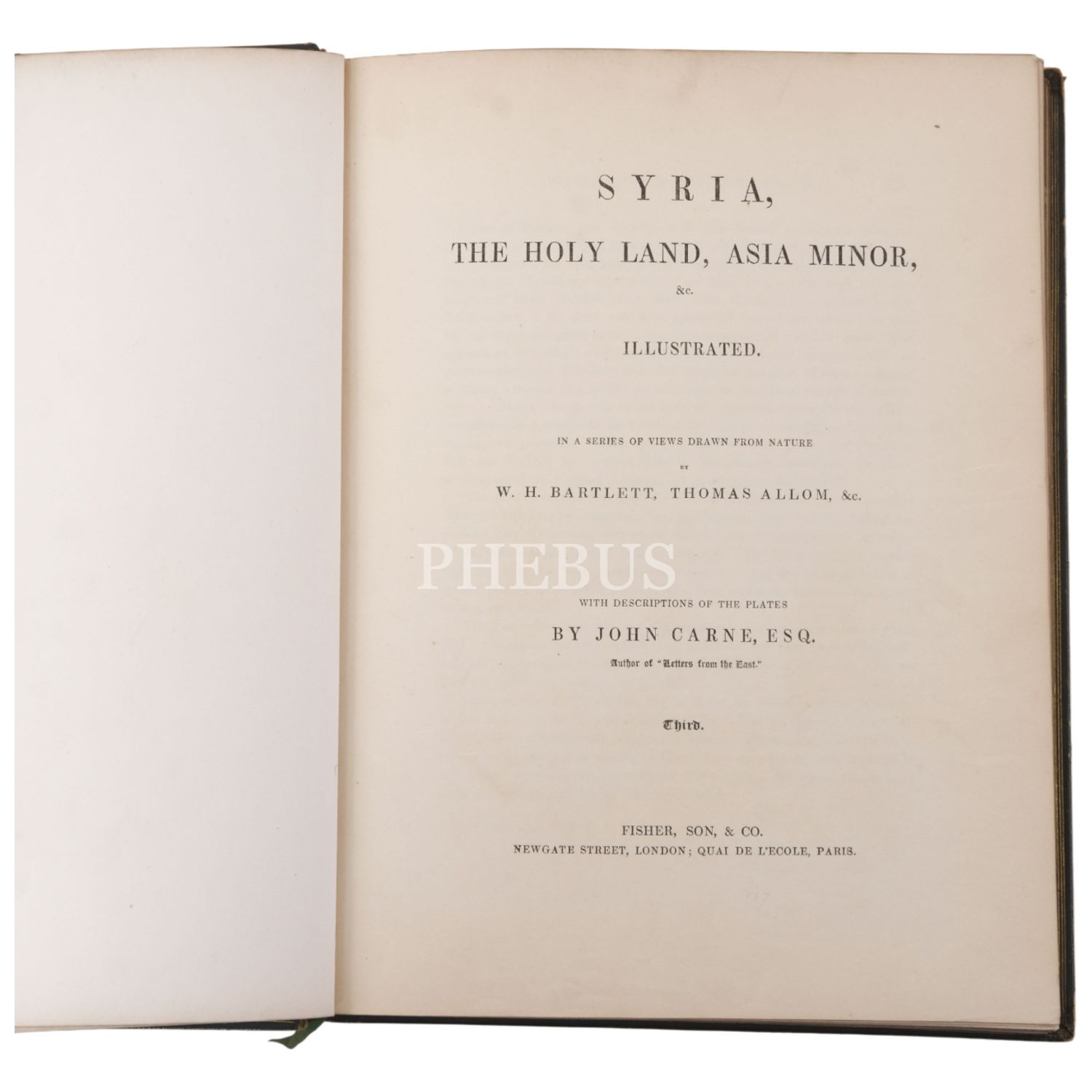 Yayıncı Fisher tarafından Suriye, Kutsal Topraklar ve Küçük Asya´daki yer, kişi ve nesnelerin doğru görünümlerini kayıt altına almaları için görevlendirilen W. H. Barlett, William Purser ve Thomas Allom´un zamana meydan okuyan gravürleri ve İngiliz gezgin John Carne´ın açıklayıcı metinleri eşliğinde bu topraklara dair kaleme alınmış en kapsamlı seyahatnamelerden biri... Sırtları ve kapakları altın yaldız tezyinatlı dönem ciltlerinde. Sayfa kenarları altın yaldızlıdır.