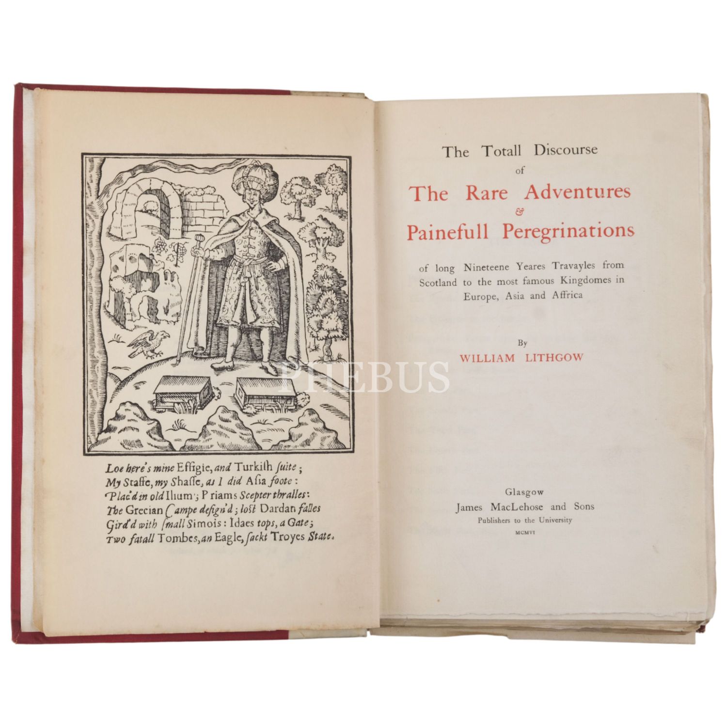 THE TOTALL DISCOURSE OF THE RARE ADVENTURES & PAINEFULL PEREGRINATIONS of long Nineteene Yeares Travayles from Scotland to the most famous Kingdomes in Europe, Asia and Affrica, by William Lithgow, 1906, James MacLehose and Sons, Glasgow, xxvi, 449 s, başlık s önünde 1 gravür faksimilesi levha, metin dışında 11 levha (1’i katlanır, çoğu gravür faksimilesi), indeks, 23x15 cm...