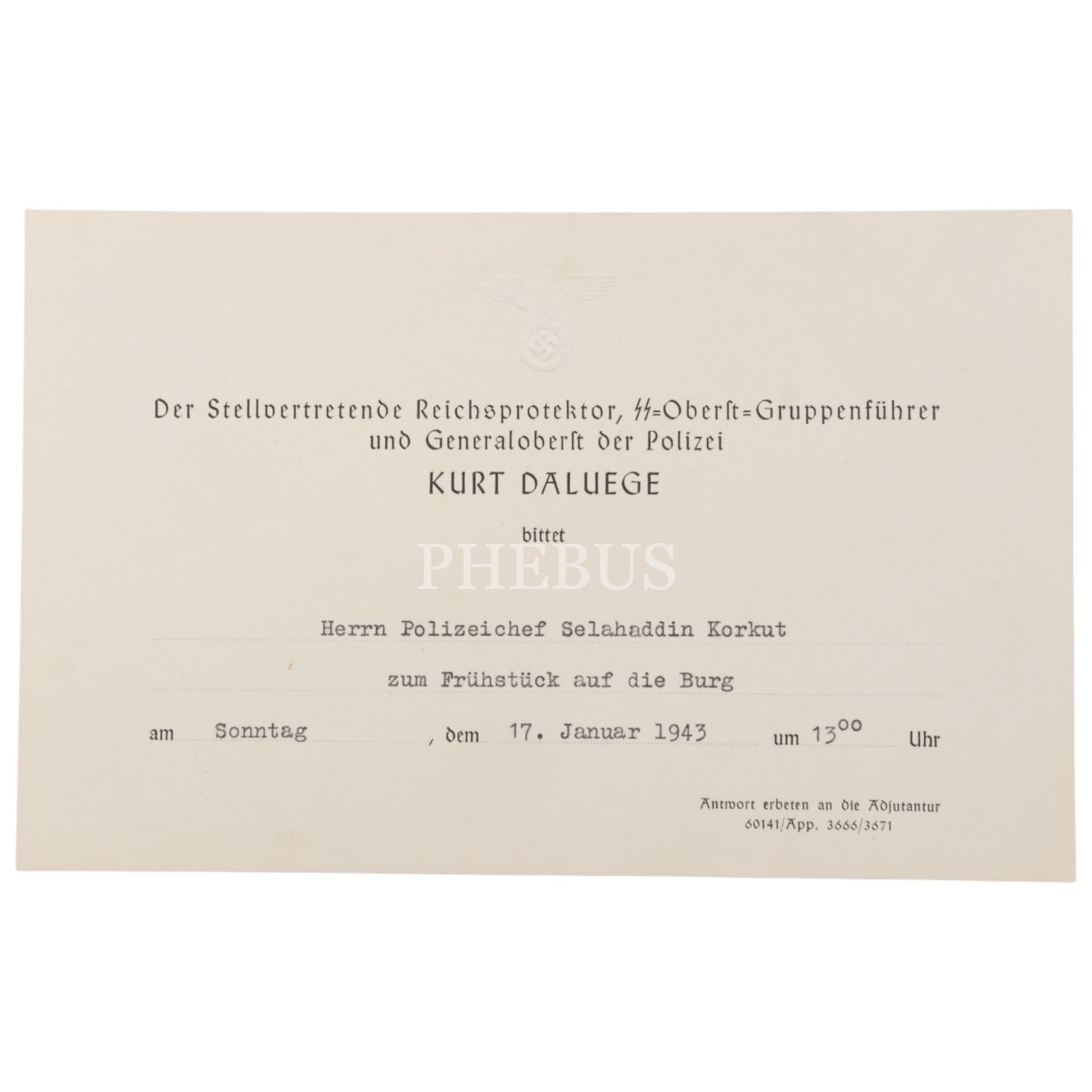 1941 yılında İstanbul Emniyet Müdürü olarak görev yapan Selahattin Korkut´a Almanca ithaflı ve imzalı (İmza sahibi tespit edilemedi). Kitap içinde ayrıca, Nazi Almanyası´nda SS-Oberstgruppenführer Generaloberst Polizei ve RSHA subayı olarak görev yapan Kurt Daluege tarafından Selahattin Korkut´a gönderilmiş kahvaltı davetiyesi yer almaktadır. Şömizli bez cildinde. *Şömizi yıpranmıştır.