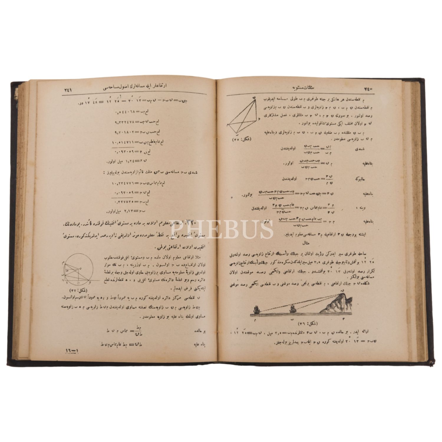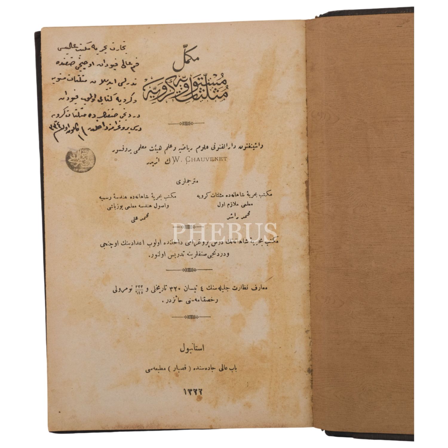 MÜKEMMEL VE MÜSELLESAT-I MÜSTEVİYE VE KÜREVİYE (1 ve 2. cilt takım), W. Chauvenet, (mütercimler: Mehmed Raşit ve Mehmed Ali), 1322, Kasbar Matbaası, 196 sayfa, 17x24 cm...